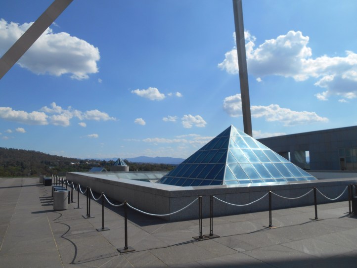 At the top of the triangle is New Parliament House. After passing airport security you are free to explore the rooms used when parliament is sitting, it is all very modern and a bit clinical. There is a lift to the roof where the huge flag is erected and a great view directly across to Anzac Parade.