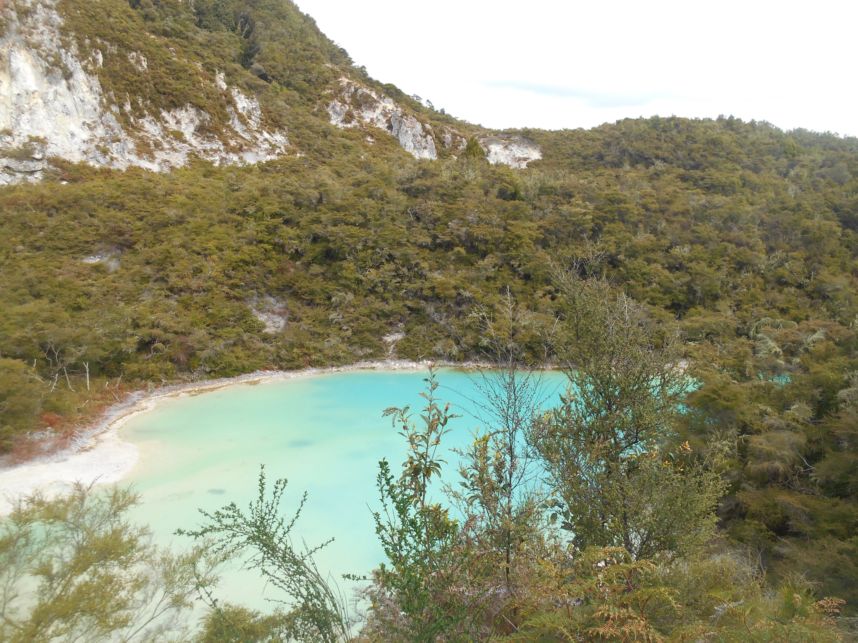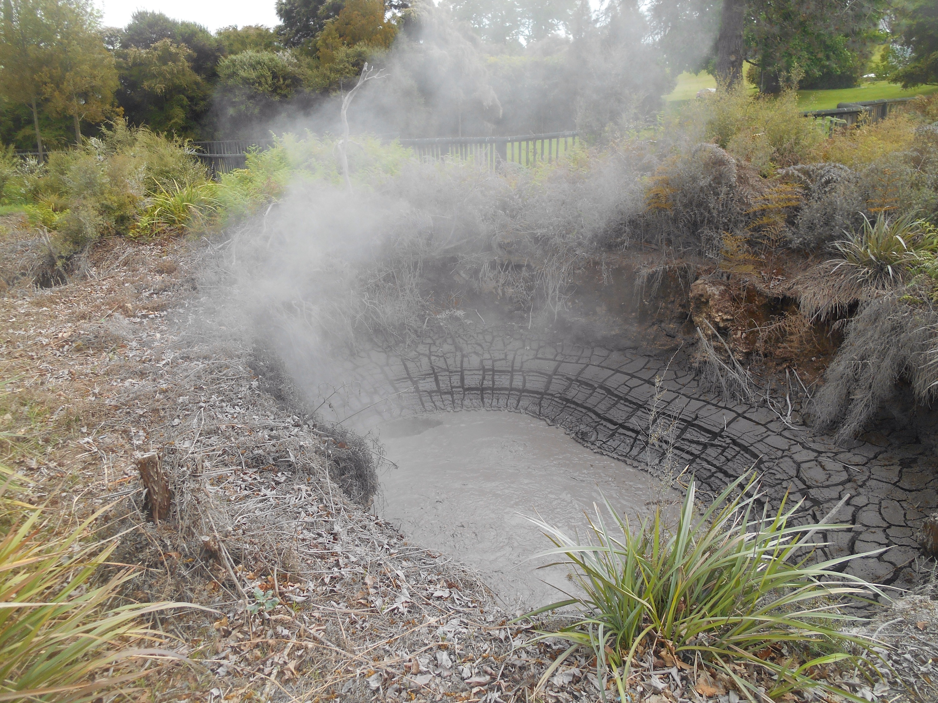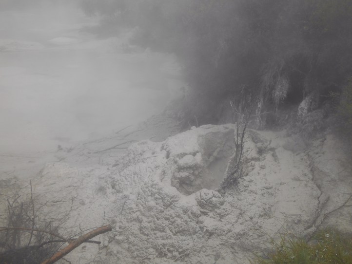 Our first stop was bubbling mud pools at Wai-o-tapu. An impressive area of boiling mud, sputtering and spurting as the heat from below caused it to bubble. It was hypnotising to watch. Our second stop was at the cafe where got brownie and sulked about the weather. I even called the bus but it wasn’t making any stops on its journey through and it looked like we would have to suck it up. We made a final stop at some hot pools under the bridge. The equivalent would be getting into a dirty river and finding it warmer than your bath. We teased ourselves getting in up to our ankles, paddling in our shorts while our top half still had 4 layers. A man in the pool tried persuading us to get in. When we told him we would love to but we wouldn’t dry, he first offered us a spare towel, and then upped his offer to a lift to Taupo for us and the bikes. To say we jumped at the chance would be an understatement. There was no English “oh are you sure, we wouldn’t want to trouble you…” We got down to our shorts and underwear and jumped in. It felt amazing to be sitting there in the drizzle in hot water.