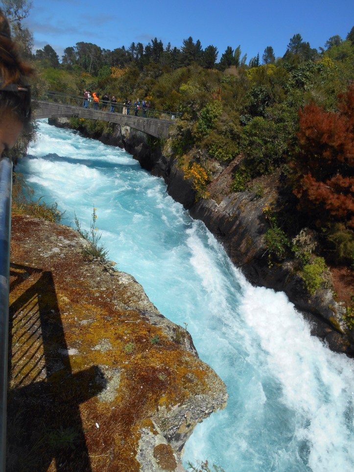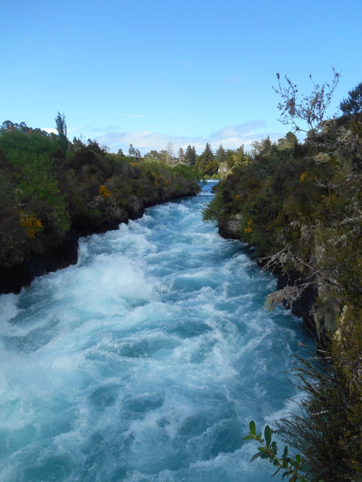 Taupo’s apology for the day before was blue sky and warm sun. We got on our bikes, luggage free and headed to Huka Falls. The fast rapids is water flowing from Taupo, condensed in a hard rock channel. The turquoise falls are an amazing sight as they argy-bargy their way down stream.