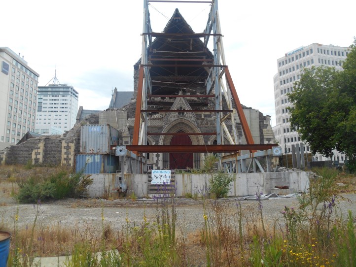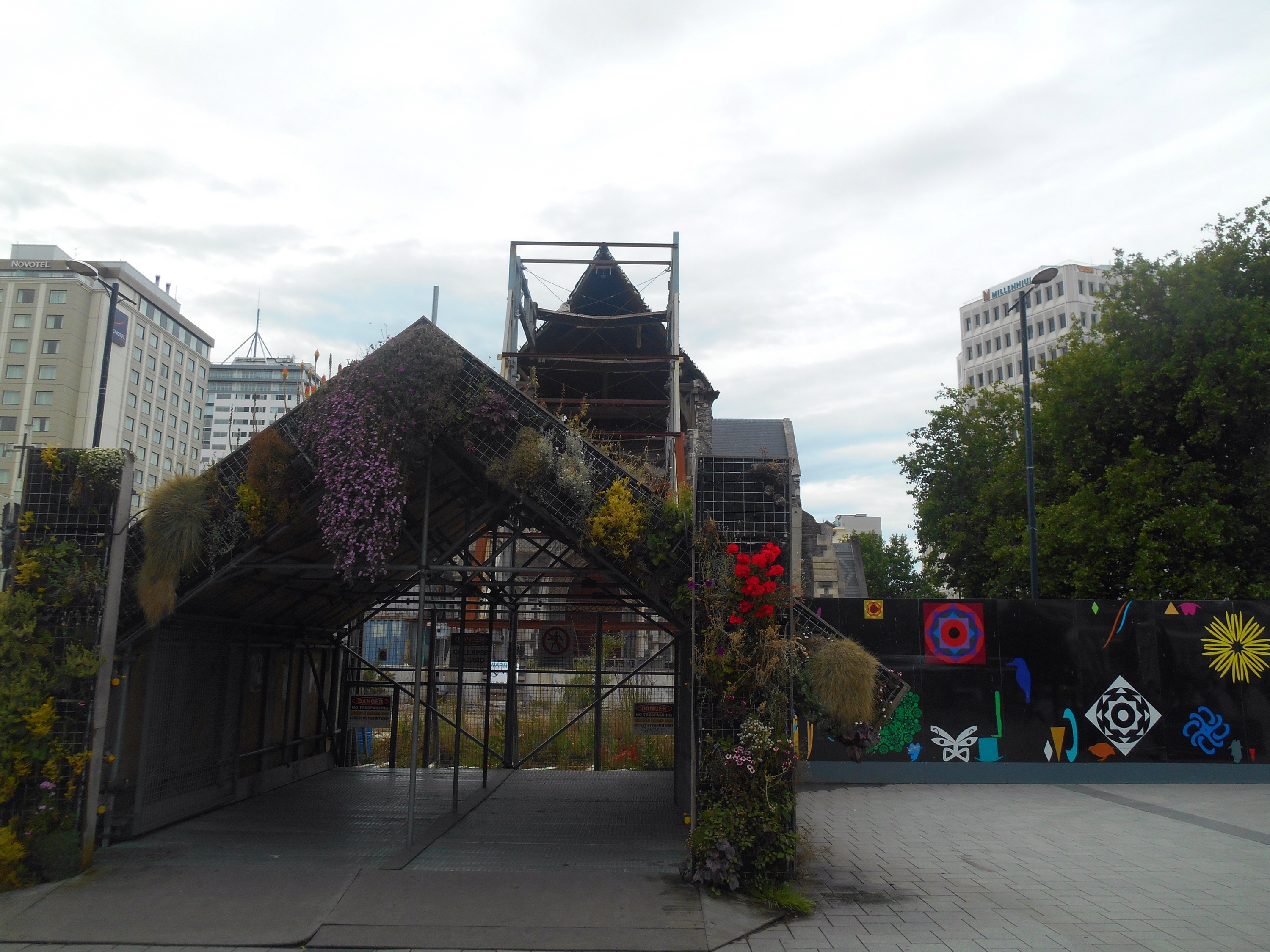 Our little walk led us around the boutique shops to the Cathedral Square, home of the Cathedral which still stands, cordoned off by temporary fencing which has been beautified by flowers. It’s structure temperamental, it’s steeple since removed and the scaffold built to support the stain glass still remains although the stain glass does not.