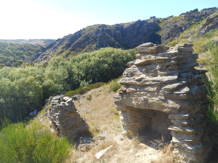 I was awoken by the sun beating through my tent, so packed up quickly and cycled to Lauder for breakfast. The station side cafe was filled with cyclists ready to start their day, the sunny spot trackside supplying hearty breakfasts. From here the trail traversed the Poolburn gorge which was absolutely stunning. The rocks dropped away steeply to the side and the track cut through the rock. Abandoning the bike, you could walk down to the camp where workers would have stayed whilst constructing the rail, remnants of their exposed camp remaining to mark their toil and achievement.