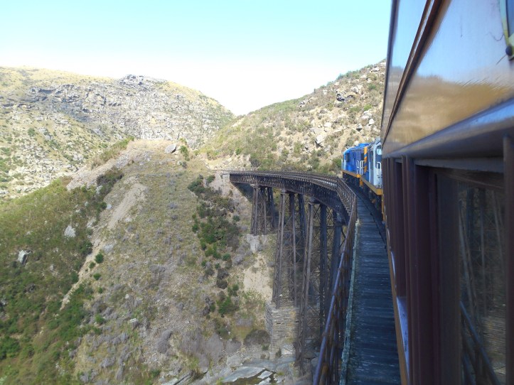 I picked up the train from Pukerangi, travelling by shuttle through bare countryside filled with stacks of rock, again a vast change of landscape in a short space. The train was an old chain of carriages, connected shakily with gaps to stand outside on the carriage behind little iron gates. I enjoyed a beer onboard, of course the local, Speights, before taking to the outside to enjoy the warm breeze and the clatter along the rails. The journey exceeded all expectations as we snaked through the gorge, across dramatic bridges, viaducts and through 10 tunnels which greatly excited the couple I had ended my journey with. Inside the carriages, the period pieces made the journey feel like a mark in time.