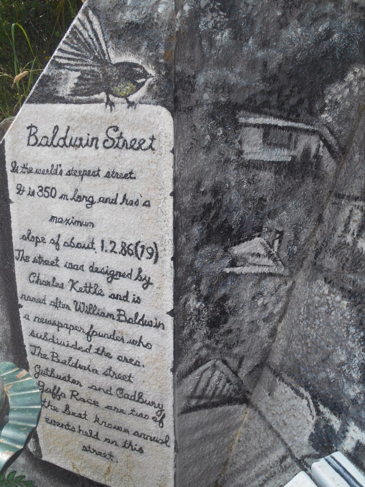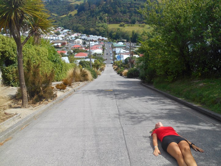 We then whizzed through town, Jordy pointing out the highlights, best coffees, biggest ice creams as well as the geology of Mount Cargill and the Otago Harbour which orientate you in the town. In the northern part of Dunedin is Baldwin street, the steepest street in the world. There are several running and cycling races on this short, steep stretch, including throwing Jaffas (chocolate orange balls) down it once a year. We took a walk up giving our calves a reason to complain and within a short distance we had gained great height, the people and cars shrinking right down. There was a beautiful mural at the top, a water fountain and a great view of the city. On the steepest stretch of incline I laid down with my head first down the hill so you could really feel the incredible gradient.