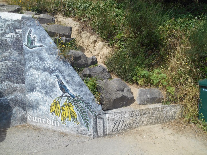 We then whizzed through town, Jordy pointing out the highlights, best coffees, biggest ice creams as well as the geology of Mount Cargill and the Otago Harbour which orientate you in the town. In the northern part of Dunedin is Baldwin street, the steepest street in the world. There are several running and cycling races on this short, steep stretch, including throwing Jaffas (chocolate orange balls) down it once a year. We took a walk up giving our calves a reason to complain and within a short distance we had gained great height, the people and cars shrinking right down. There was a beautiful mural at the top, a water fountain and a great view of the city. On the steepest stretch of incline I laid down with my head first down the hill so you could really feel the incredible gradient.