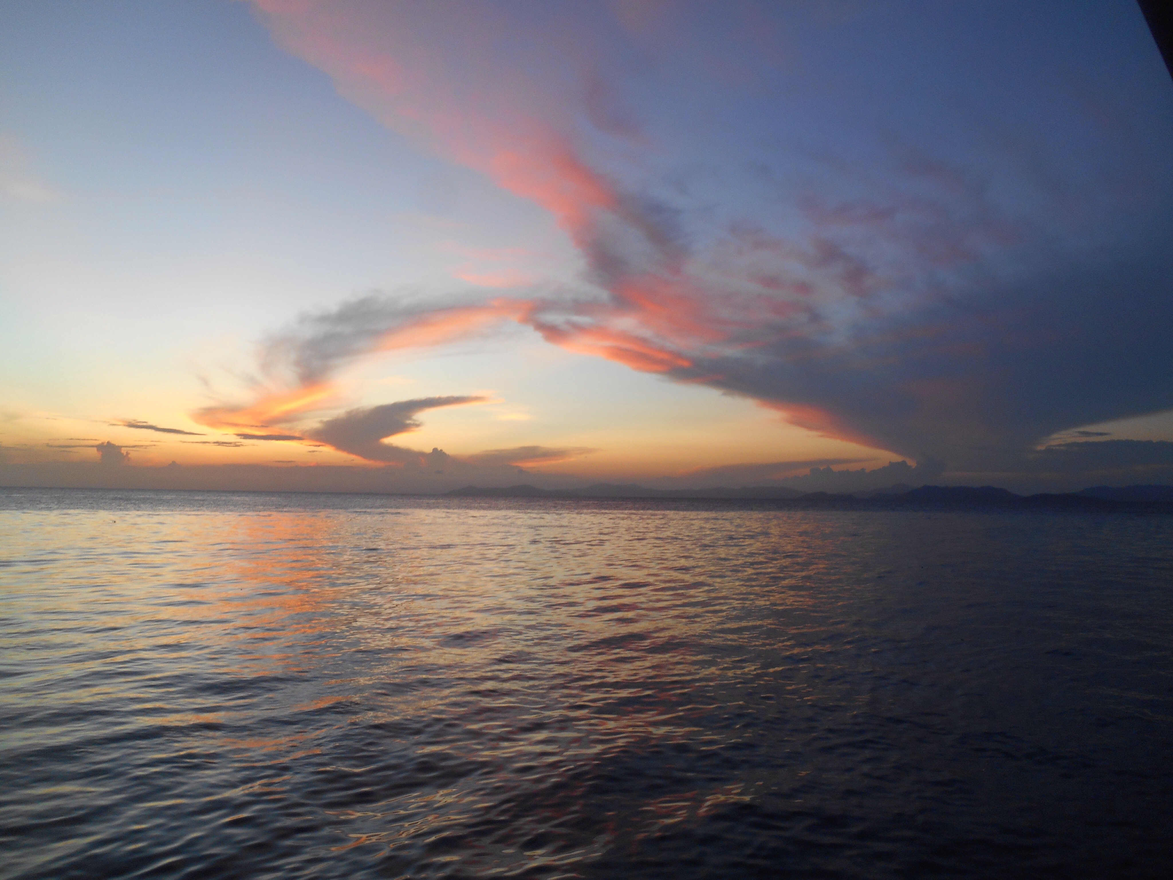Among many friendly people, I became good friends with Colin and each evening we would wander down the beach westward to watch sunset from a simple bar named Uncle Chang. The rickety boardwalk led out to a platform on the ocean where locals played volleyball and children splashed around in the water acknowledging us with a “hello, what’s your name?” and a fit of giggles if we actually replied. Here as the sun dropped off into the ocean, it tinted the clouds pinkish.