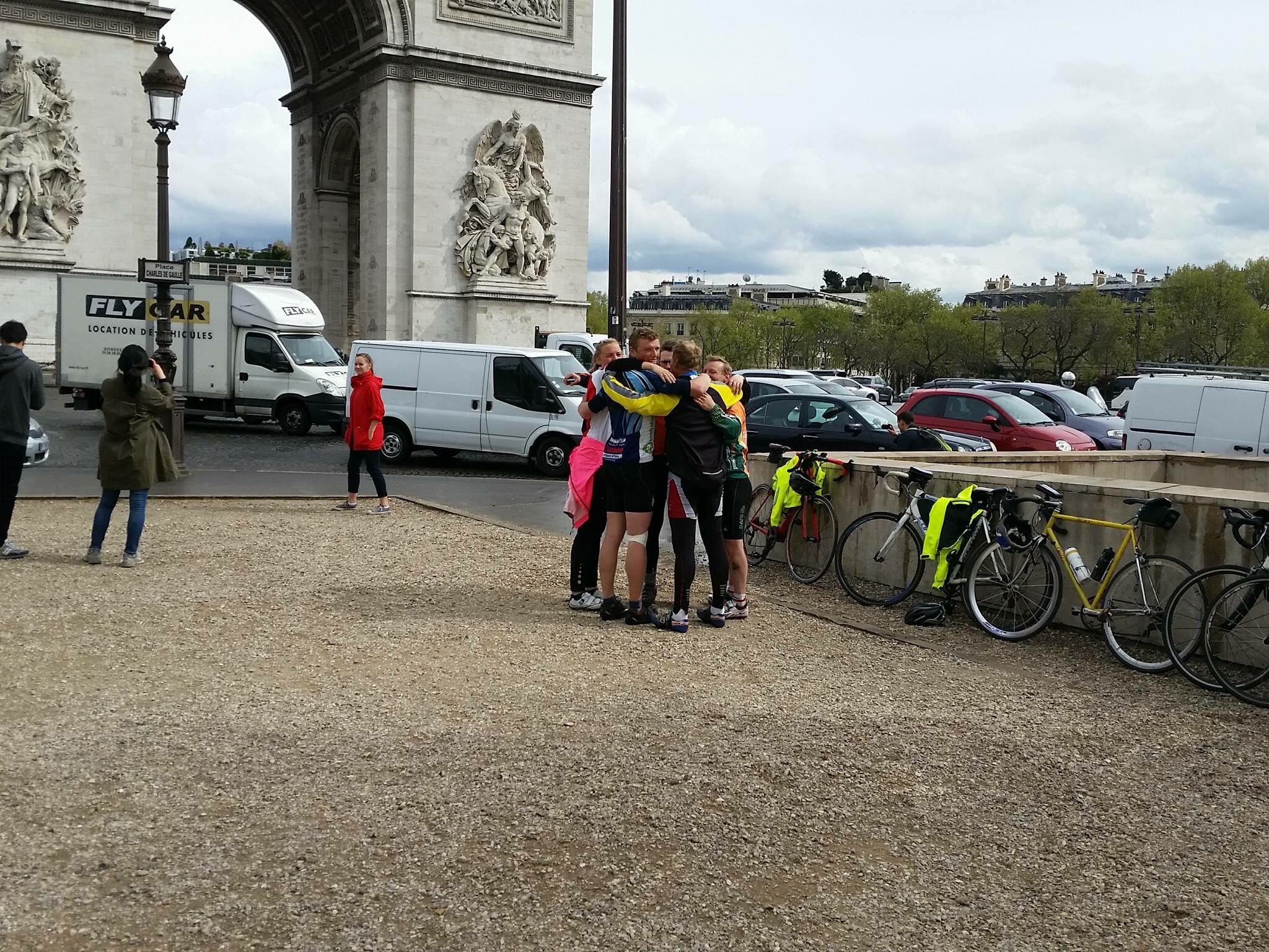 We were back to a strong six for the mornings cycle to the outskirts of Paris and made for our earliest lunch stop ever in Pontoise at 12:30. This is not to say it wasn’t a tough morning as we had headwind and hills, but for the most part we were strengthening from our trials, recovering from our soreness and speeding up! Far from the set order of the first few days, there was lots of variety in who led and who followed. We had lots more singing and a strong lunch set us up for the more urban last 25 miles into Paris. We swapped out Kate for David who was still suffering with his knee but after 48 hours out, couldn’t resist the last stretch, so would ride one legged. Have you ever tried so hard for something and then been overtaken by a man with one leg?