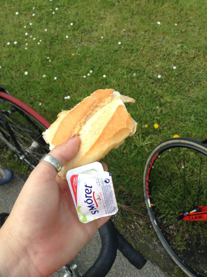 We kicked on, no one daring to point out that this was a shorter day. Abbeville was a gorgeous town, so nice we gave ourselves a few detours and a trip the wrong way up a one way street before leaving, of course up a hill. We, at this point down to the feisty five with David and Kate still out, got pelted by some particularly strong hail. Dad insisted I have a tow, something which I had been particularly nervous about, and I cycled about 20cm from his back wheel. We flew through the French countryside acting like something from the Pelitan, admittedly not taking in the views as I had to concentrate on the spinning his back tyre making sure he didn’t falter on a pot hole. Convinced I would dream only of babybel that night we went around a roundabout, only for him to stand on his breaks and declare “wrong direction.” With no time to react I bumped his back wheel, abandoned the bike and rolled a few times into the ditch. I emerged muddy and laughing, the most impressive fall so far and with no pain due to the soft earth I had encountered.