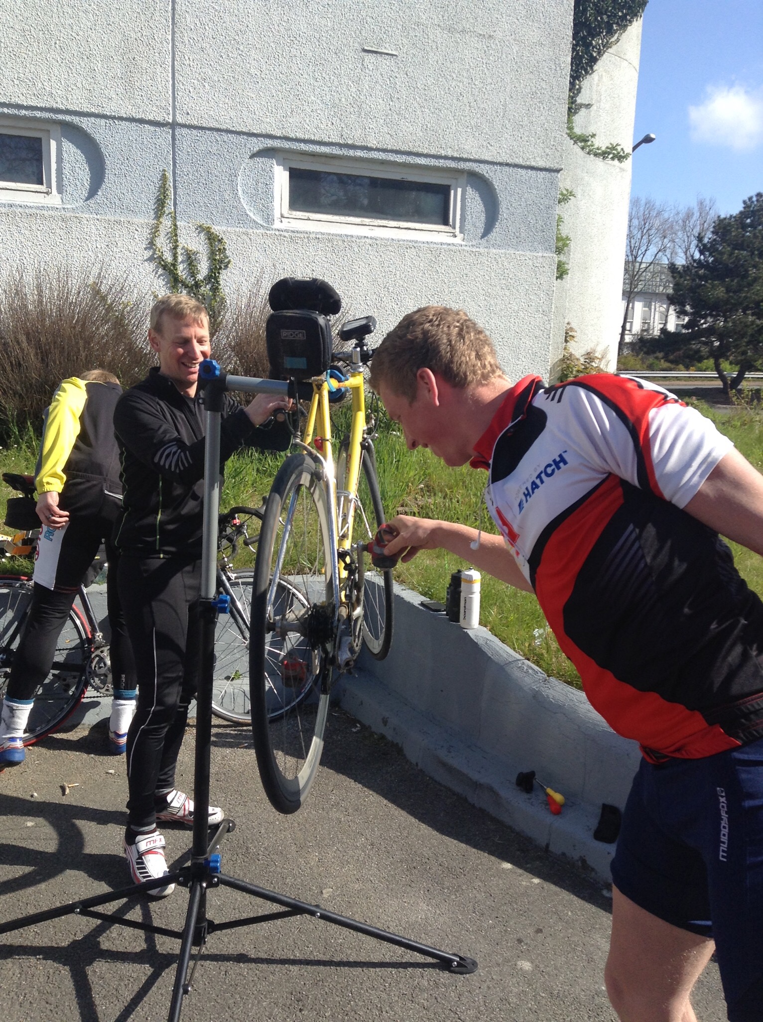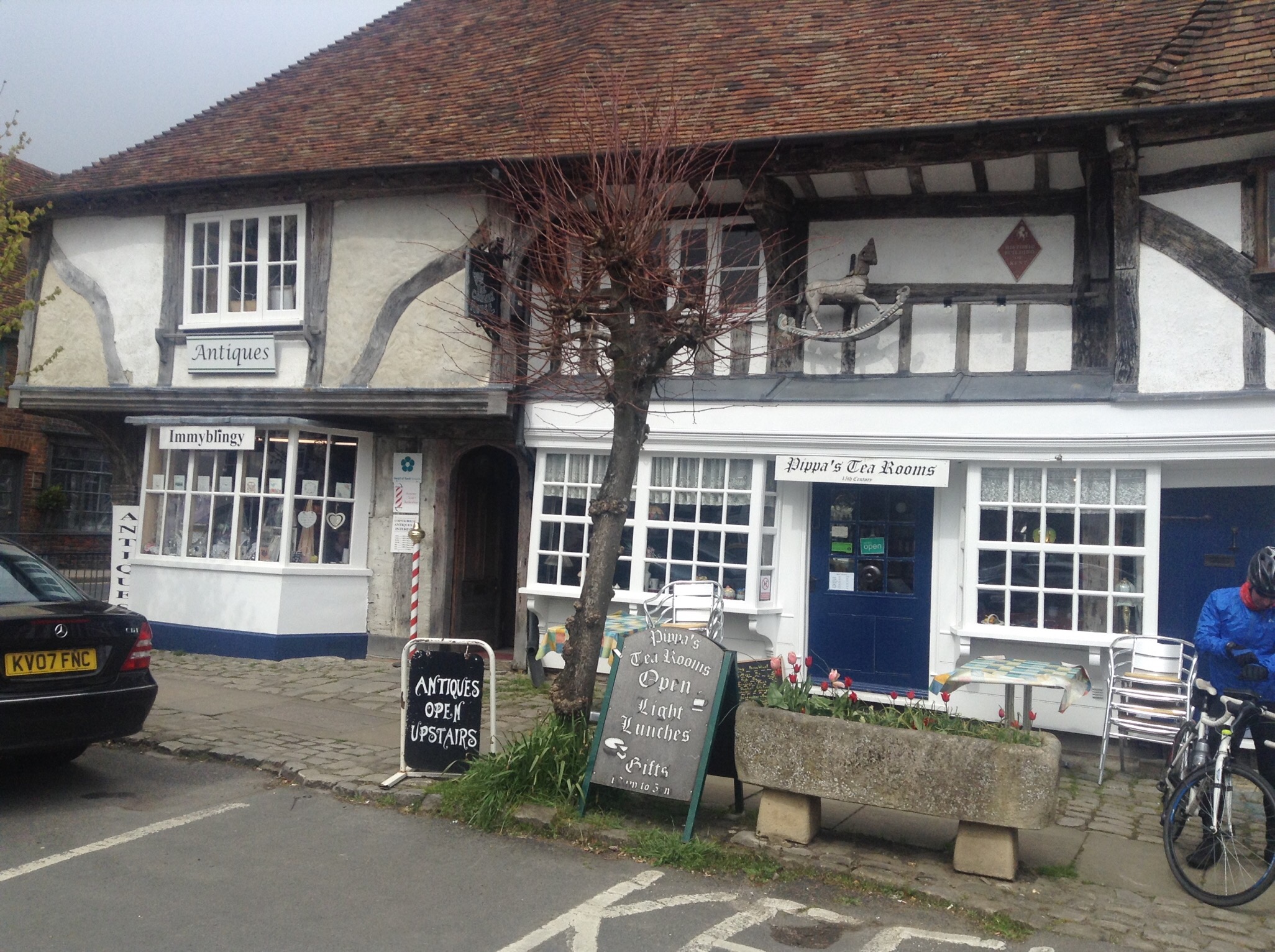 We stopped at Lenham for lunch, again we felt like we were powering on but still hadn’t made half way. The stop was induced by a flurry of unseasonal April snow which was perishingly cold, but a Kentish tearoom soon warmed us up with light lunch and tea. By now our saddle soreness had kicked in fully and most were either sporting a funny walk or could be seen wincing when getting back on the seat. As we repaired Andy’s tyre once more, we headed on in search for the big hill.