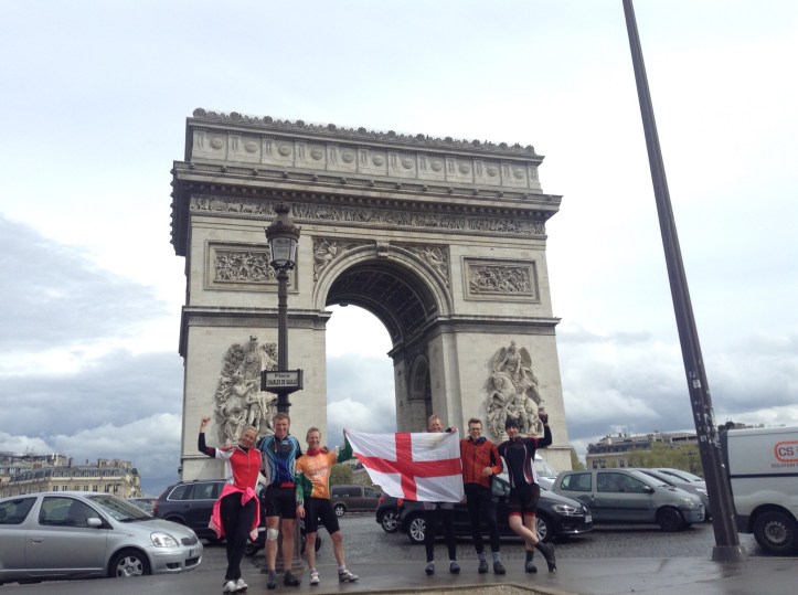 We met the Seine and crept into the city riverside, no one daring to get too excited. When it got to the last 10 miles, I felt it acceptable to ask for updates every 400 metres. We rode up to the Arc De Triomphe for a victory photo and dad produced his St Georges Flag. This was it, we were in Paris. Suddenly being somewhere recognisable made it seem surreal that we had ridden here. It had been hard because it was hard, we were in Paris!! Dad, David and Andy took on the roundabout where as the life valuing amongst us took the underpass under the 12 lanes of adjoining traffic, to the Champs Elysee. How would you like to end your 570km cycle? Red carpet? Nah, cobbles for me please..!
