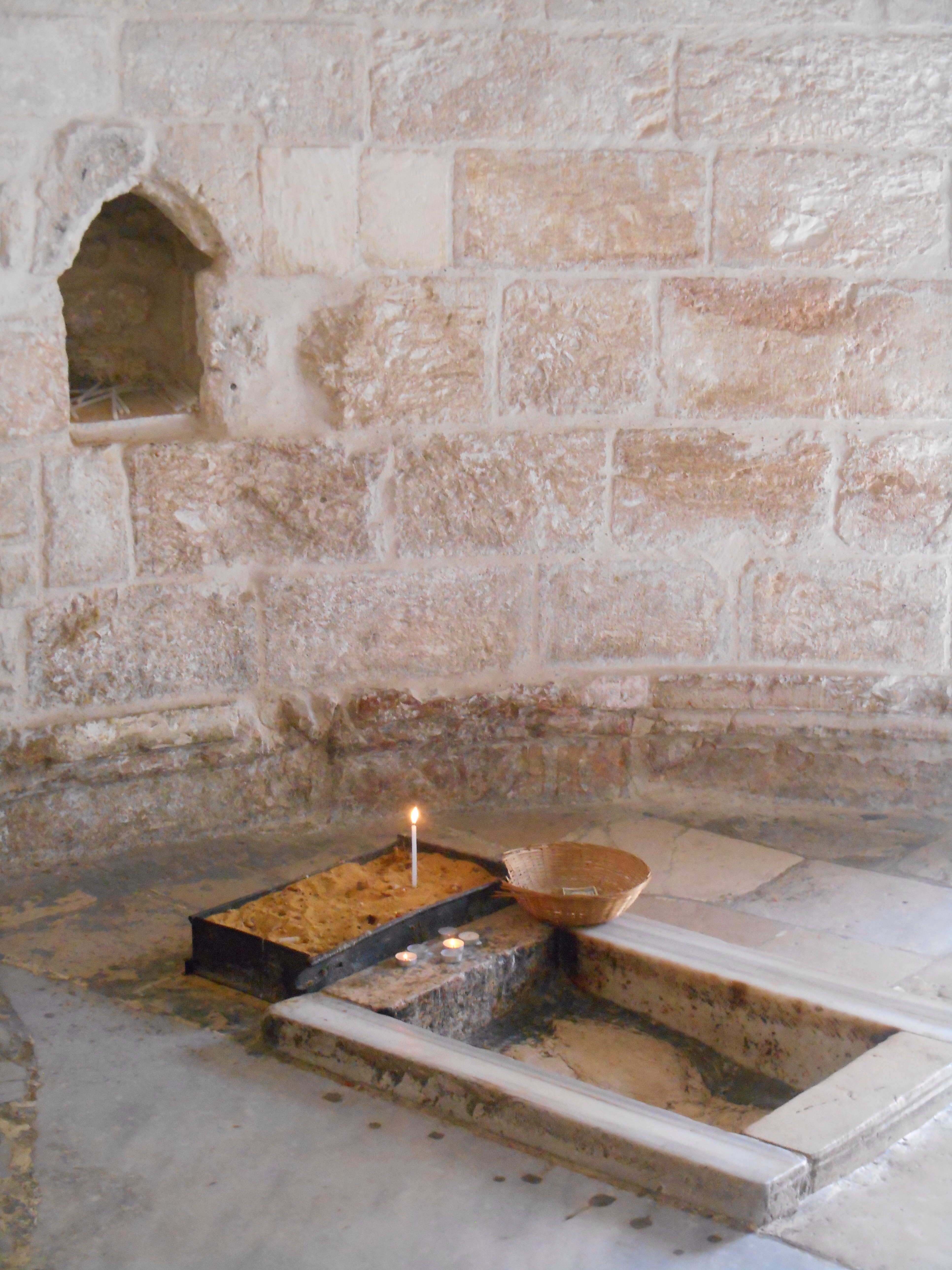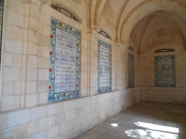 We walked through many of these significant sites, following Gin who had his arm thrust out infront trying to make enough shadow with his tiny umbrella, so the four of us could escape the suns glare. At every stop we crouched against the wall trying to find shade. The garden of Gesthemane was a beautiful spot just outside the city walls, the place where Jesus was praying with 3 disciples when Judas betrayed him by kissing his cheeks. The garden is filled with olive trees, many dating way back and many being added by visiting popes over the years.