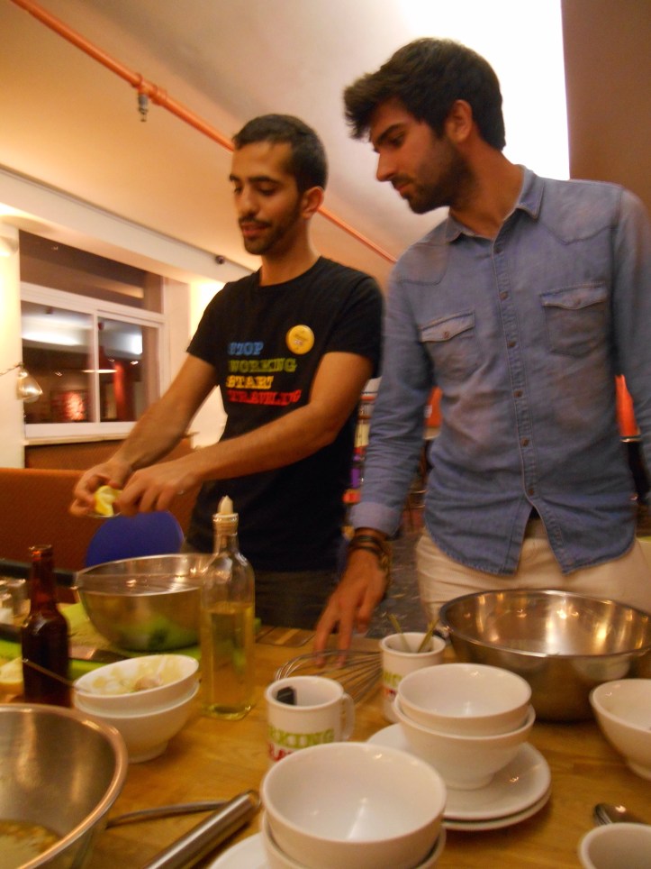The weekend in Israel is Friday and Saturday, Saturday is the sabbath, Shabbat which starts at sundown on the Friday night and lasts until sundown Saturday, officially until 3 stars are visible in the sky. Shabbat has its own set of rituals and it is observed that no work is done on the sabbath so everything shuts down. No buses or trains run, most shops and restaurants close and the Jewish people use the day to rest. Having just arrived to Jerusalem, a hostel Shabbat dinner was a tempting prospect and I joined the happy helpers to prepare salads en masse. Bonding over chapped tomatoes and salad seasoning, Gin, Marius, Korka and I quickly became friends and when the time came to enjoy the feat we sat together.