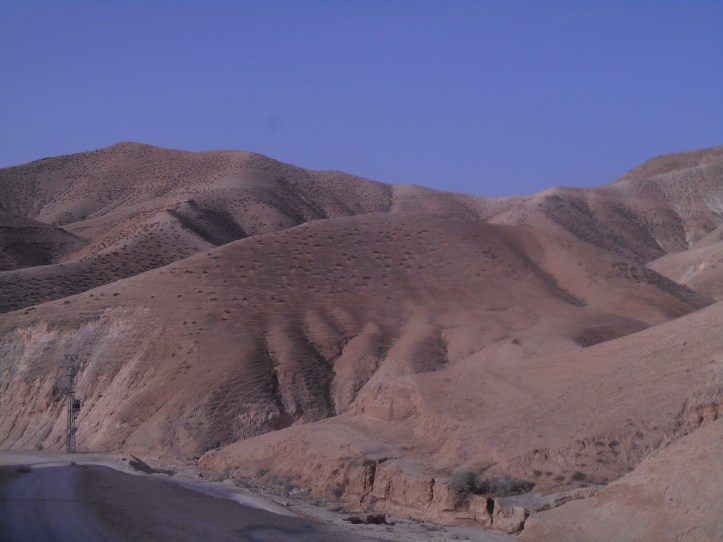 Bleary eyed and excited we set off early the next day to the Judean desert. This meant leaving Jerusalem through a long tunnel which thrust us out into countryside, much browner and less populated than before. The driver called it the time tunnel, as if travelling back in time. Jerusalem is 800 metres above sea level and the Dead Sea is at 423 metres below, the lowest point on earth, it was a long downhill journey. We passed some fig plantations sprouting green out of the dry looking earth.