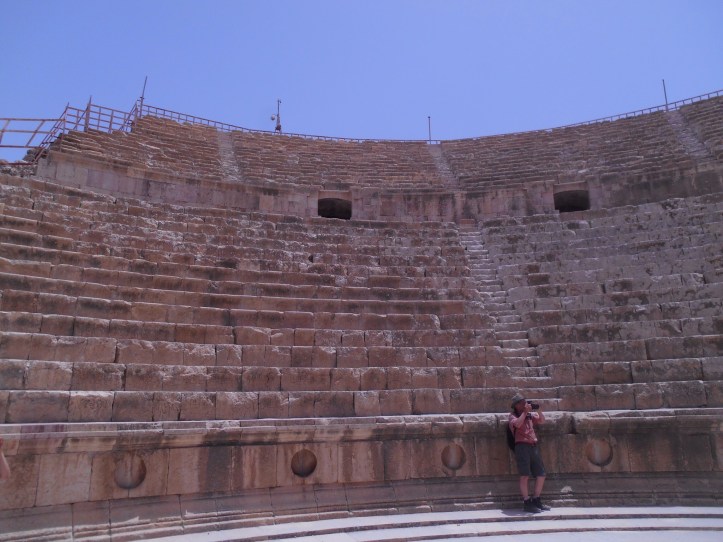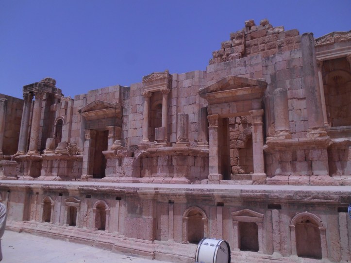 In the largely complete stadium you could imagine the many spectators looking down over the stage where stairs to the backstage could still be seen. In the very centre was an acoustic stone which I tried, certainly your voice projects simultaneously in every direction from this finely tuned spot. Also around the seats was more acoustic mastery, indents when spoken into you could clearly hear the next person. In came two Jordanian men with instruments, the bagpipes and a drum. Our guide Ali, who had a great sense of humour, announced they would play us some traditional Jordanian music just before the sounds of Scottish melodies rang out, a remnant from the time of the British Mandate.