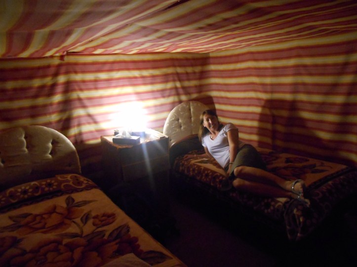 We had a long drive south to where would stay the night near Petra in a Bedouin camp. Arriving after dark, our first sight was a hill covered in candles twinkling, then we were inside a basic camp, a big firepit with seating, an open tent for buffet and seating areas all covered in the beautiful red and black Bedouin print material. The food was lots of fresh vegetable dishes, breads and cream cheeses, with some lentil soup to start and then we were all pleased to be shown to our rooms so we could freshen up, the hot day only added to by the cooling breeze which meant we were all very dusty and windswept. Inside the tent was a very comfortable setting. Mums and I had twin beds with lots of bedding, light run of a generator from after dark until midnight and a candle for beyond that.