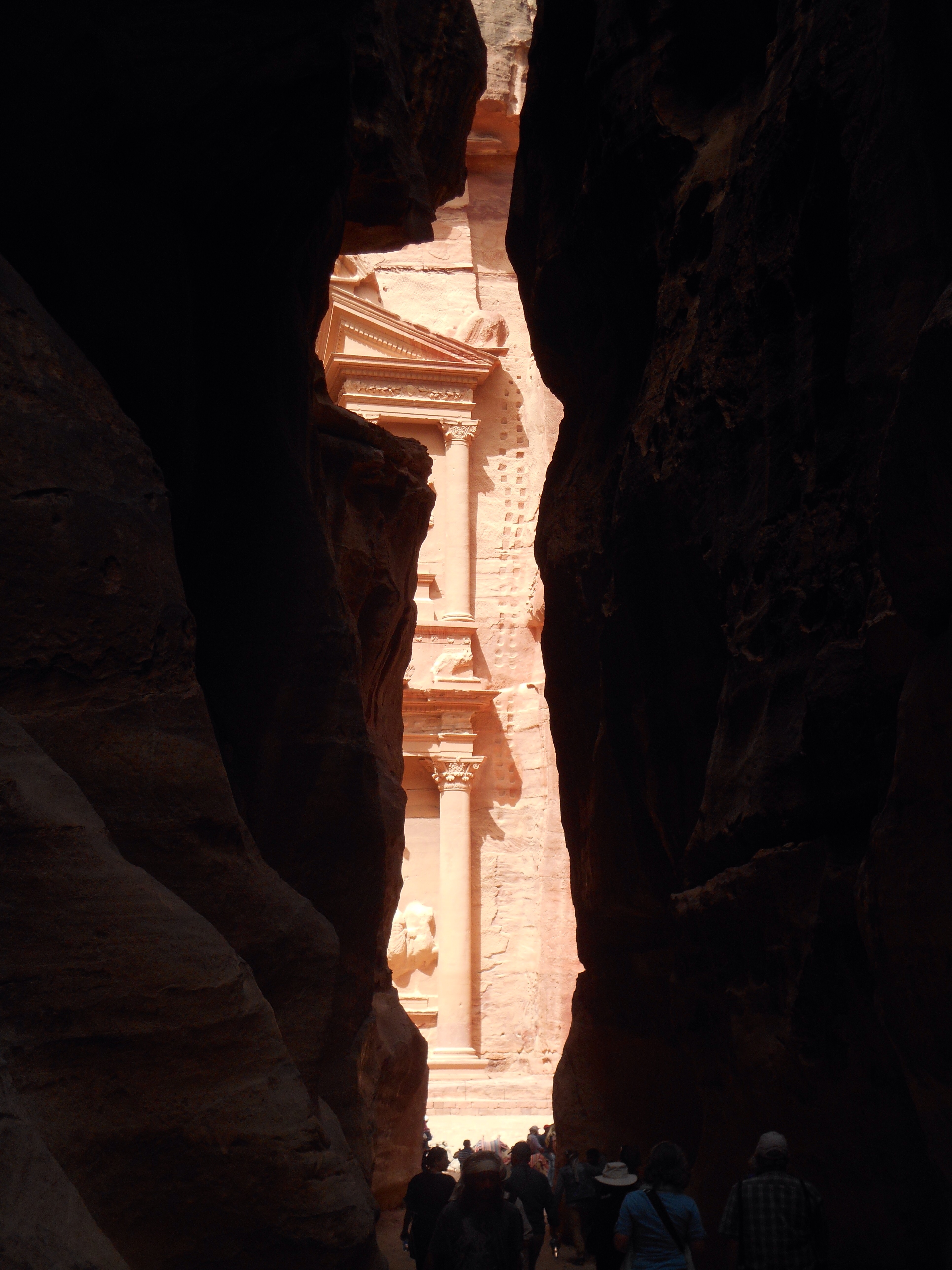 By this point I was already taking too many photos of the fascinating natural surroundings and Ali said “now if I can just get you all to look up here, what do you see?” As we puzzled he then pointed to our left and there, the treasury appeared at the end of the siq, the recognisable face of Petra, wow.