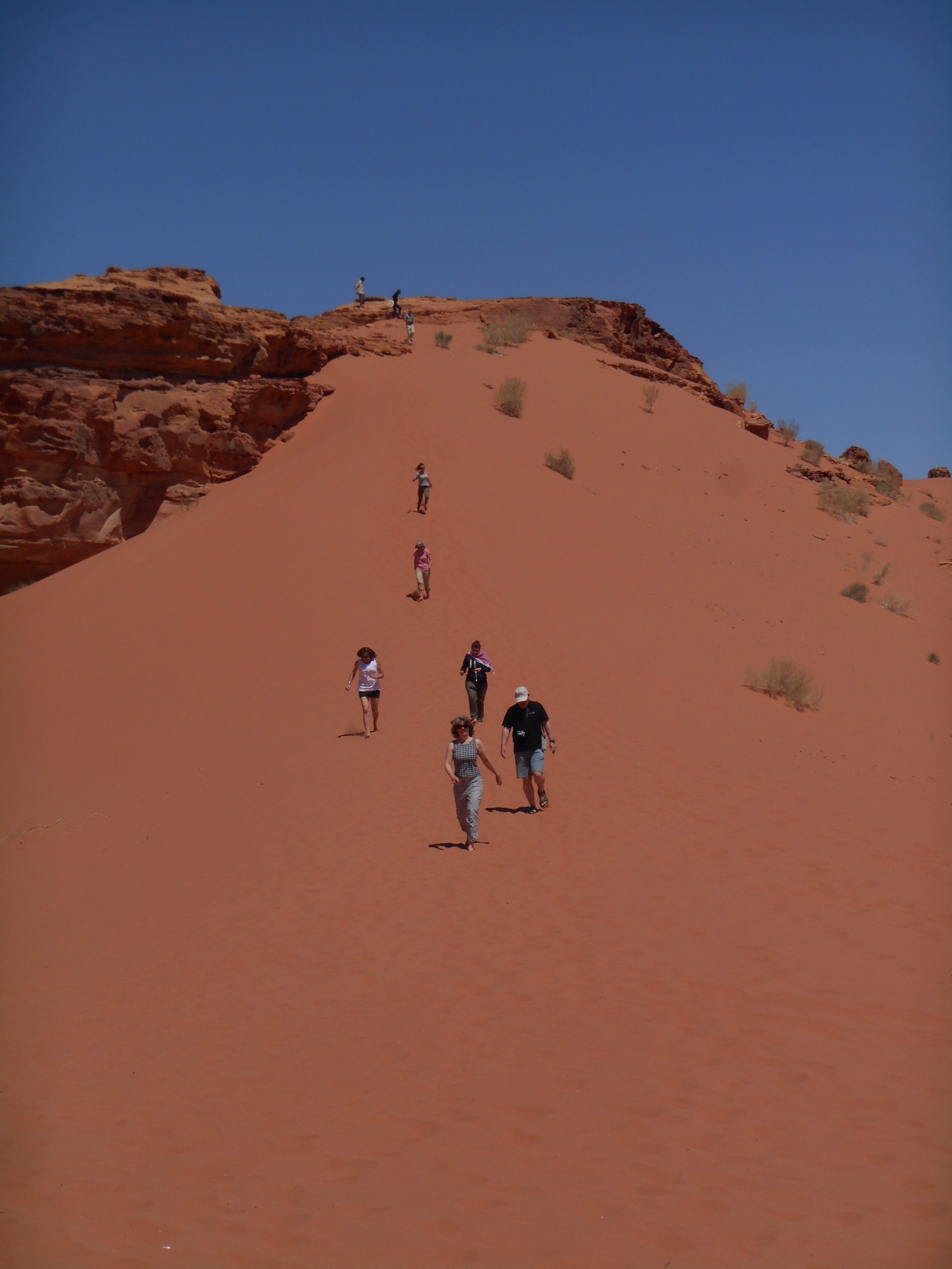 We were to be shown the desert in the back of very old looking jeeps and splitting the group into two, we set off into the vast sandy distance. The wrinkled Rocky Mountains were on every horizon, the most recognisable, the seven pillars of wisdom. Despite the heat underfoot we ran up the sand dunes to be treated to an incredible 360 view around. The most fun bit of course being able to run back down the sand dune at full speed pulling your feet out from under you just in time to prevent falling on your face.