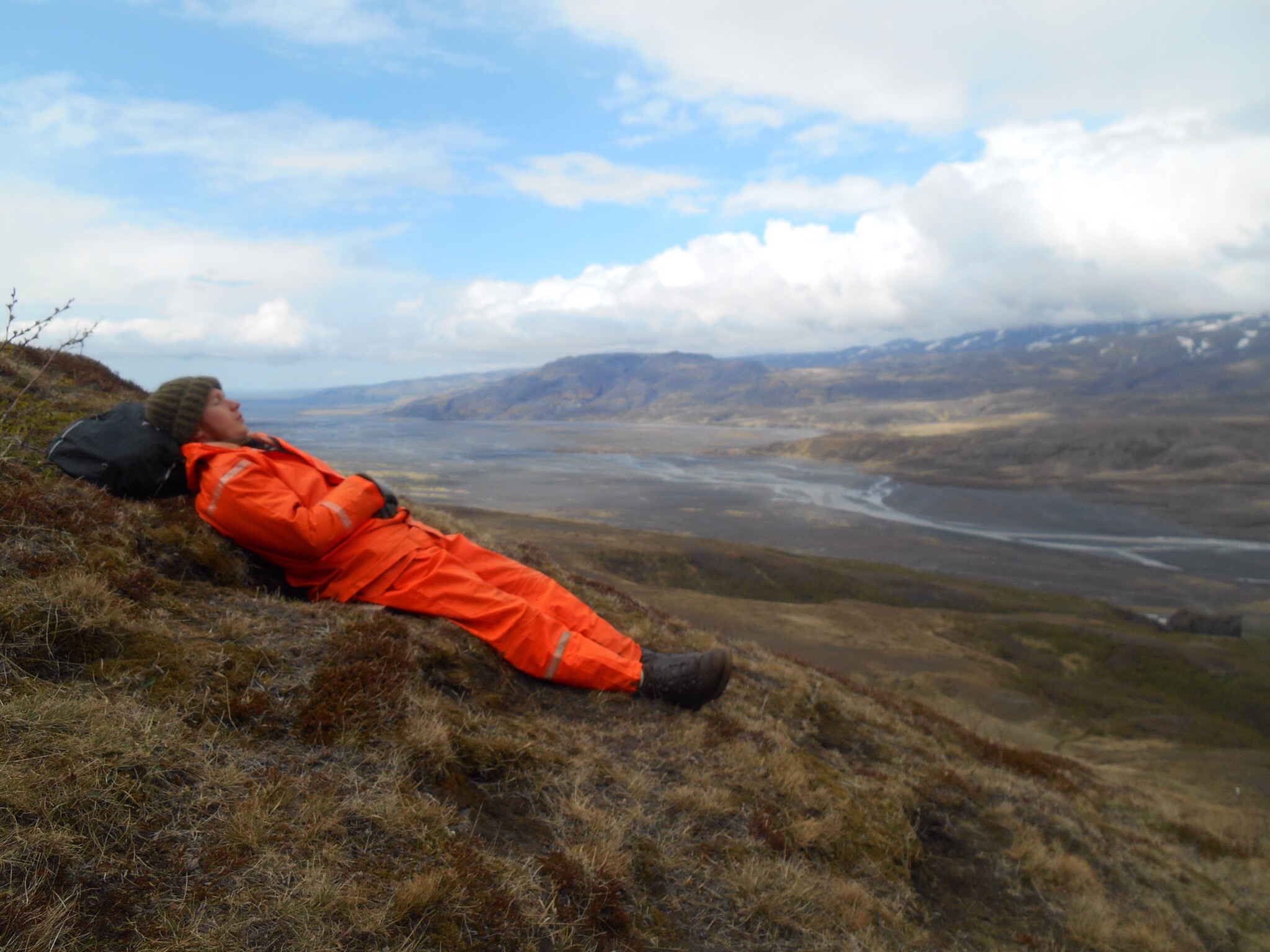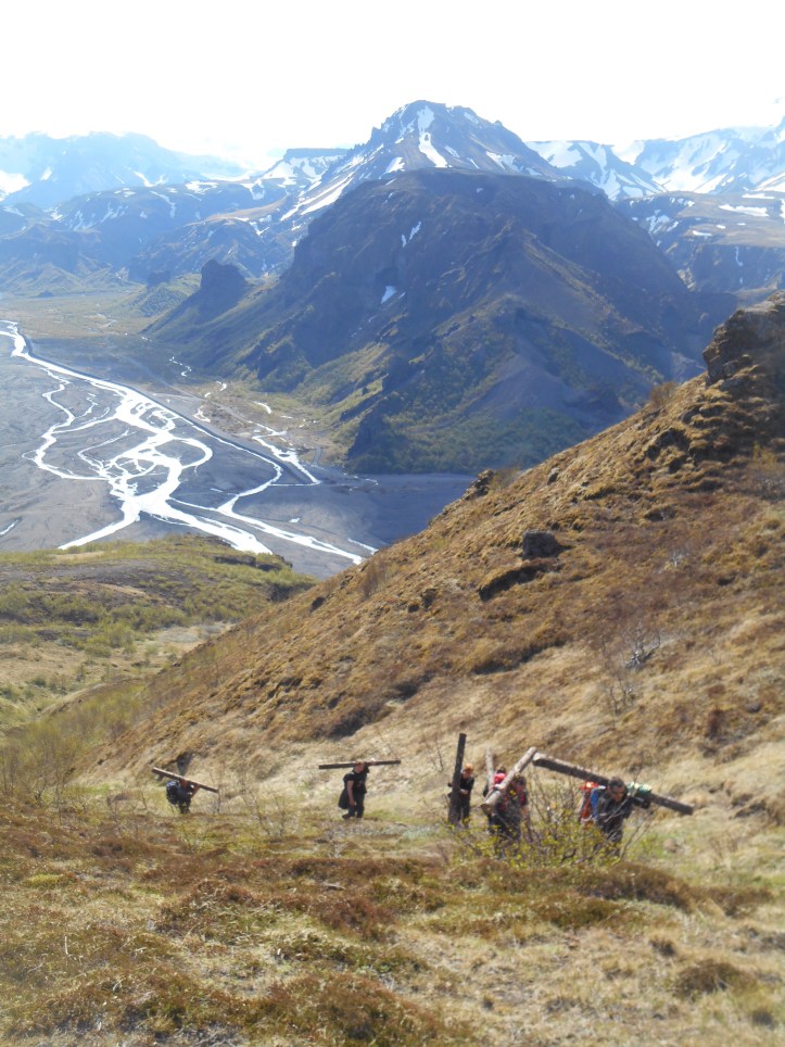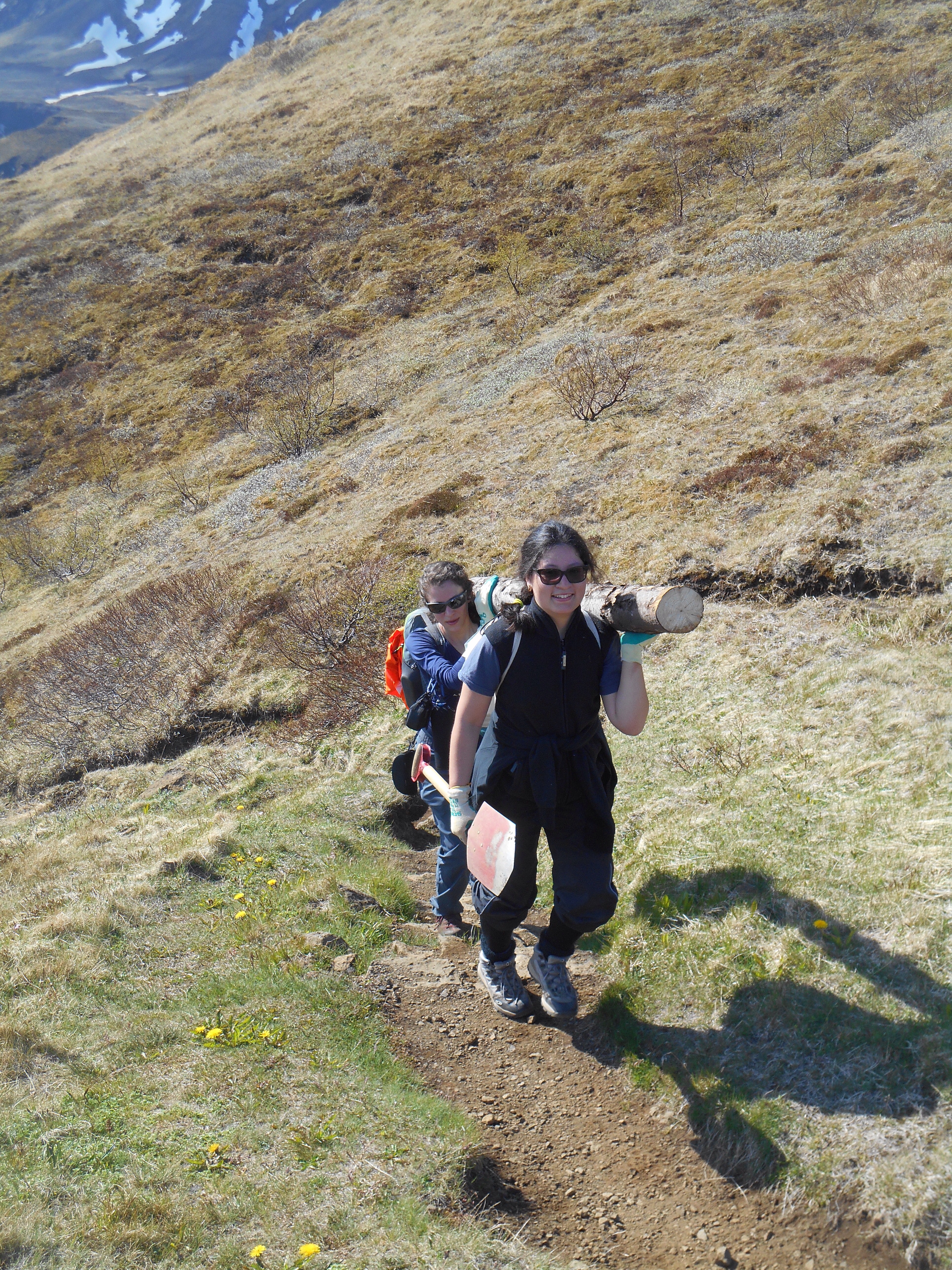 On day one of work we rose to a gorgeous sunshine welcome to Iceland, the snow capped mountains glistening under blue skies. We made breakfast, packed lunches, had our morning team meeting and were assigned our work waterproofs, big, industrial, bright orange waterproof trousers and anorak. Almost like they wanted to associate you with community service. At 9am the work day began, the work site was Valahnakur, on top of the big mountain behind us. The first task, to get the tools to the top. We started with the logs which we would be using to make log drains. One big log each and a long trawl to the top with several stops. If anyone was in doubt about building muscle here, it seemed not an option. Luckily, it was time for tea break and the view was unbeatable, on the side of the mountain looking down over the vast surroundings with two volcanoes, not your usual backdrop.