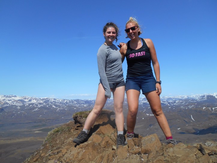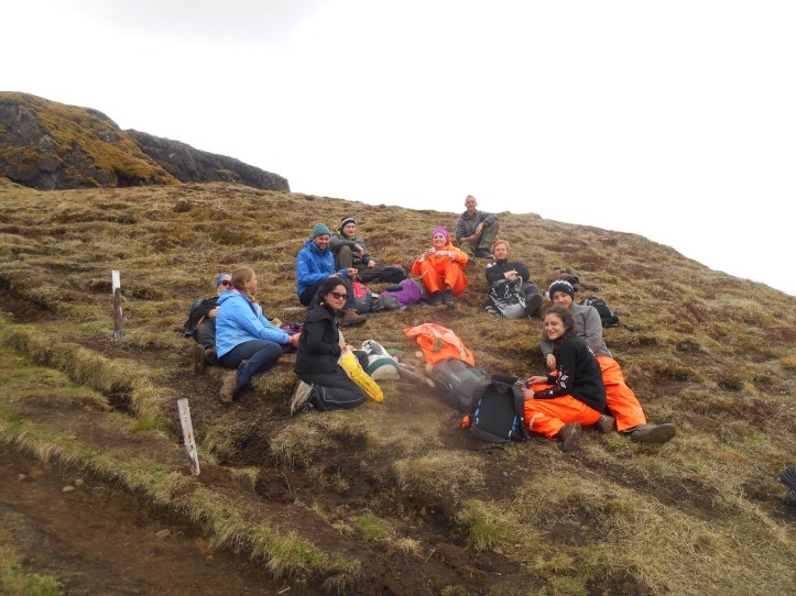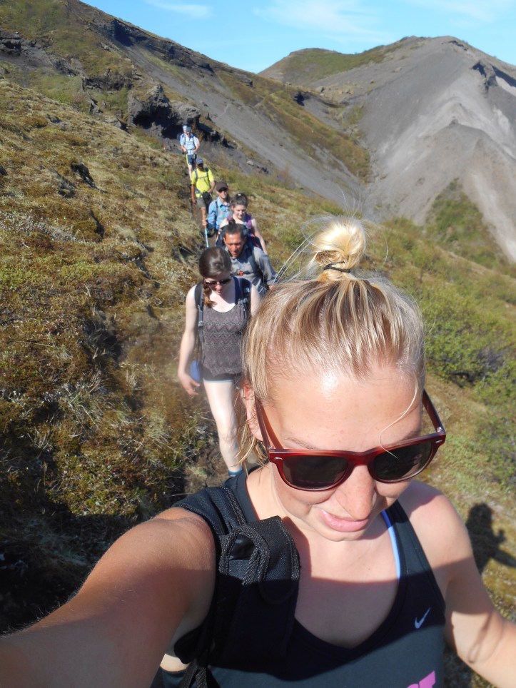 On Friday, the last working day of our first week, we were treated to a hike to Rjupnafell, the second highest peak in the park. Far from being a chance to relax, it worked different muscles and challenged the fitness and strength we had started to build. It was hard to believe how short a time it had been as 18 of us snaked through gorgeous backdrops of mountains of our back garden. We stopped for a break at the troll church, a giant jut of rock, one of many in Iceland where stories and folk tales become blurred together. We filled our water bottles with icy Icelandic water from the stream and pushed on, through snow trails and dizzying paths until we started to climb, zig zagging steeply up the side of Rjupnafell. Everyone separated, pushing forward at their own pace, so as one of the first to the top you could guess who would be next to emerge over the ridge and make their way to the fantastic lunchtime viewpoint at the top.