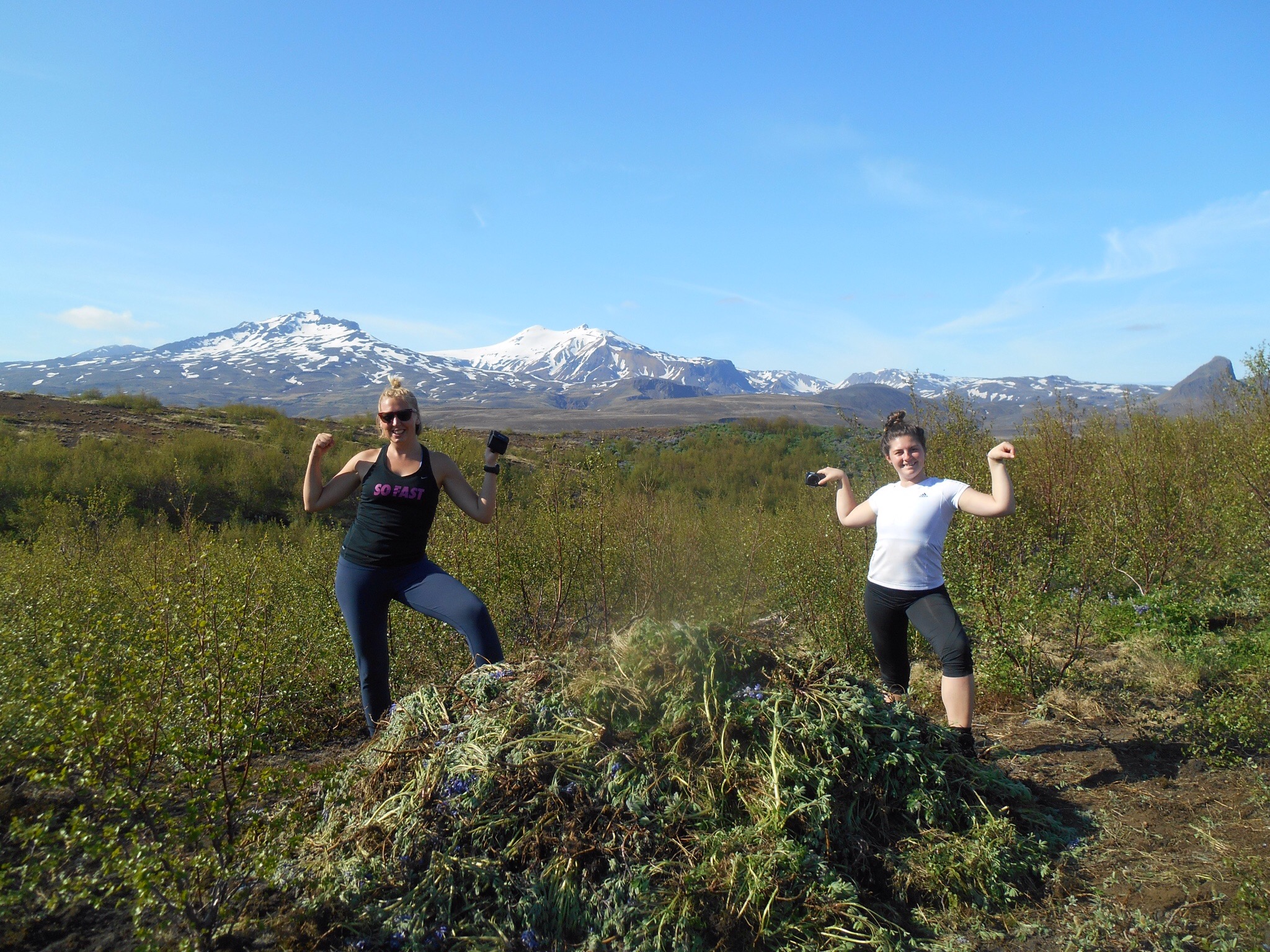 After three days heavy labour, we did some gardening. Joining up with the B’asar team we headed to the lupin fields to weed this invasive species. Lupins were planting on mass by Icelanders as a non native species to fertilise the soil as they transfer nitrogen from the air to the soil. As with all introduced species, their introduction to the chain often means they take over and so we split into groups with trowels, spades and forks to up turn these plants and their strong, hefty roots. The day was scorching and the work equal parts therapeutic and monotonous so it was a great opportunity to share stories and laugh together.