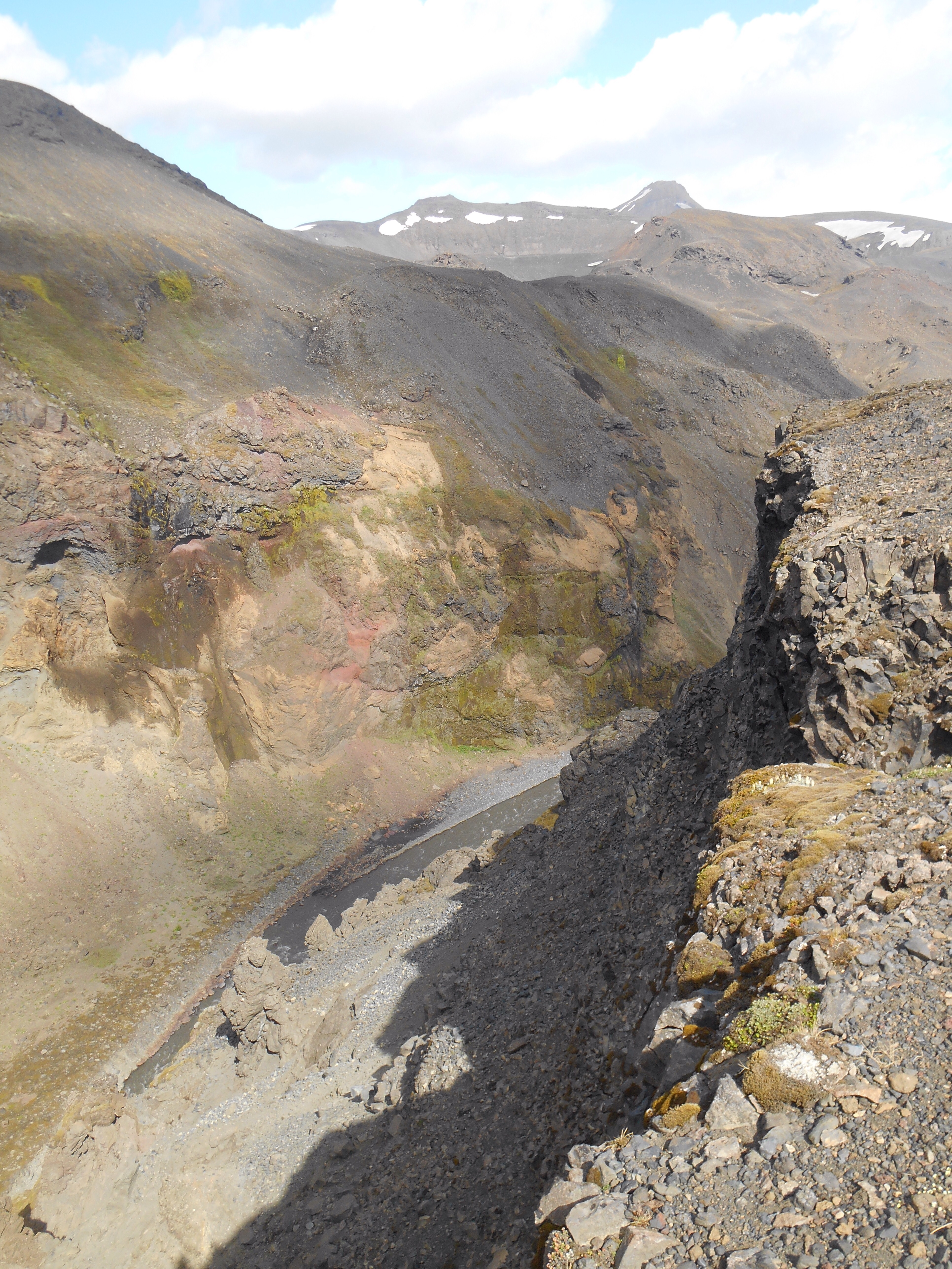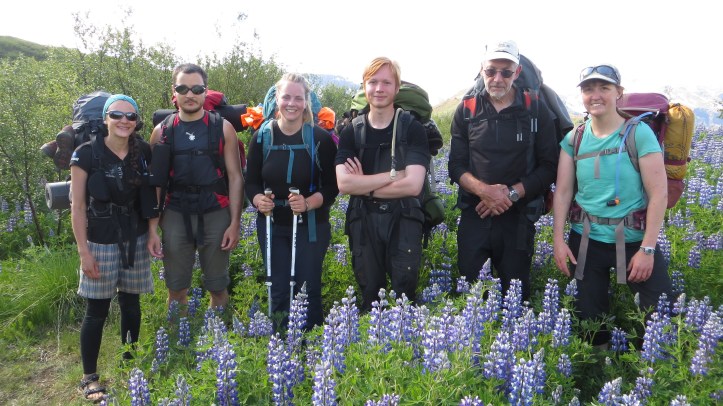 On Tuesday I added a new title to my CV, Sherpa, as Anna and I offered to be food porters for the long range team who would be spending the remainder of the working week 15km down the trail. We stuffed our packs with high fuel goodies for them and led the way up through the lupin fields and across the fast flowing Throngar river. At 3.5km from base, Chas often describes this river as the divide between home and wilderness, and certainly once you have plunged your hot feet through the icy river, the landscape transforms into a vast moonlike scene. We passed our long range camp and collected the tools from our stash, checking on the progress of our work a week on as we pushed further up the Landmannalaugar trail. The rapidly melting snow means the surrounds are ever changing and only a few kms on the scenery blows out to a panoramic view, the scale of which is quite hard to comprehend. There in the valley below would be their camp.