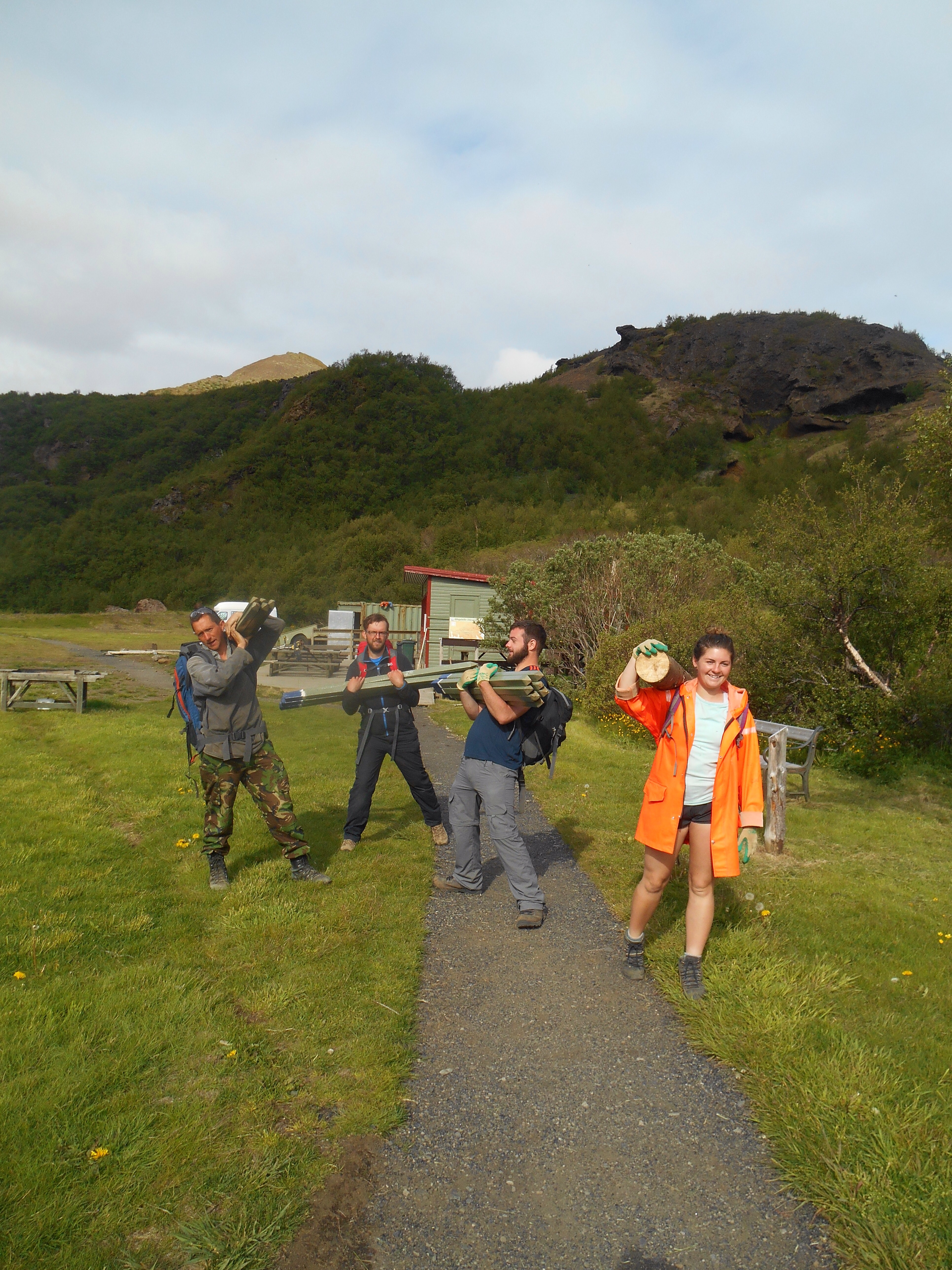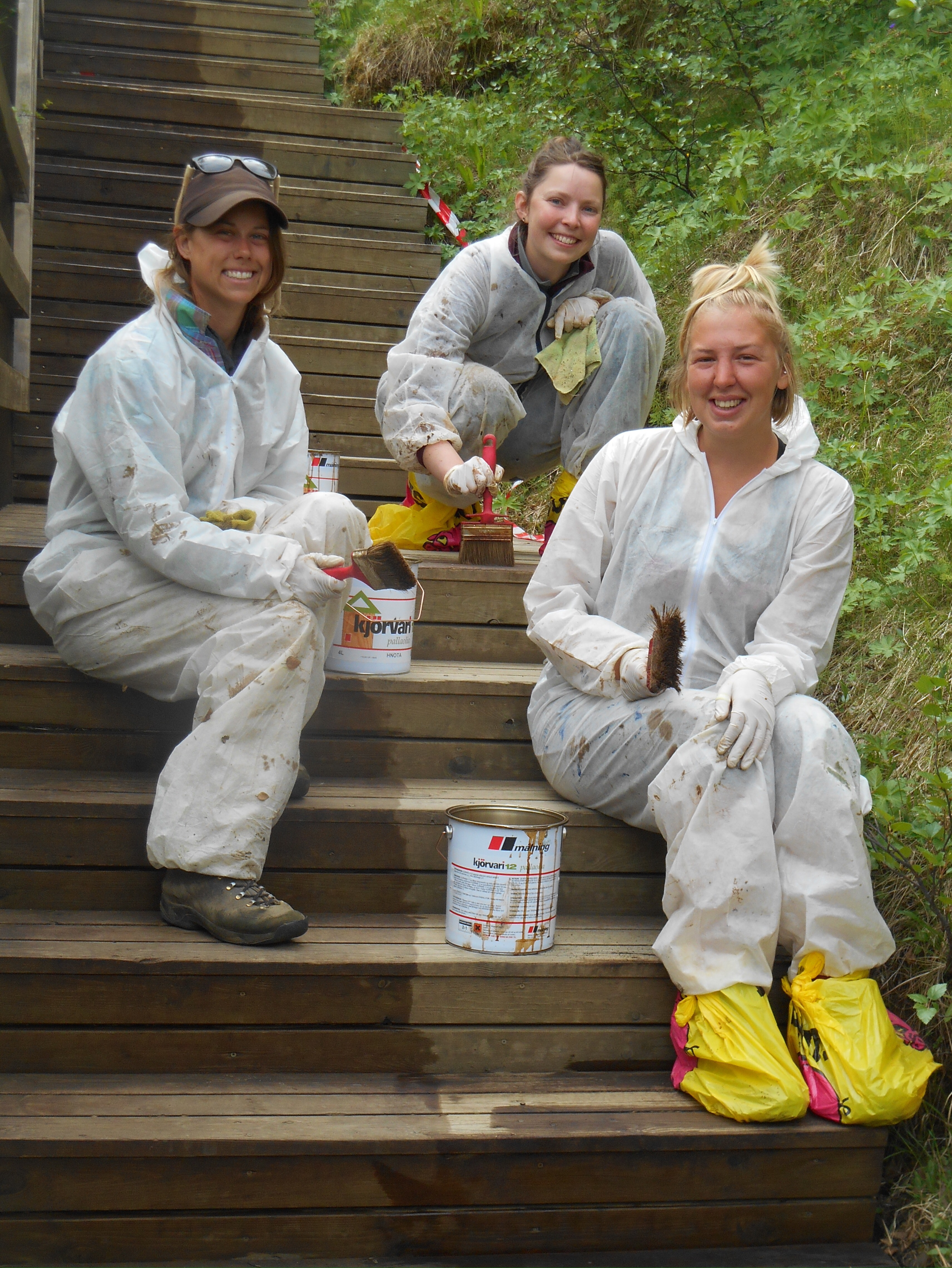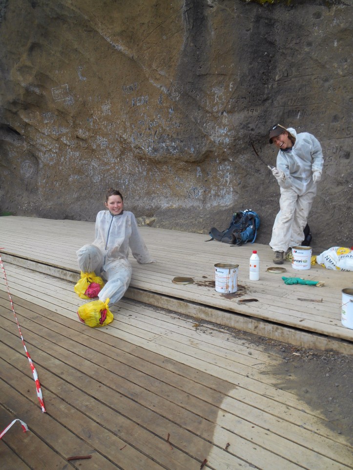 The week past quickly, every day meaning different biscuits but the same calf burn. Our Friday wind down task was staining the wooden steps by Snorri’s cave. Our fashionable attire included a paper paint suit, plastic bags for over shoes and some surgery gloves. As always, the passers by paid a lot of attention to our work beautifying the park no we heard several different accounts of the caves history. The commonly agreed story is that Snorri’s was an outlaw, chased by farmers maybe for killing some of their sheep. He climbed into the cave to hide and was cornered from the outside by farmers and dogs for days. Submitting to his fate he threw down his food and prepared to starve which convinced the farmers he must have plentiful supplies, and they left leaving him free to climb down.
