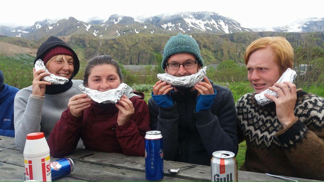 We never imagined the amount of suntanning opportunities we would get in Iceland and spent the afternoon in a little sun trap watching a helicopter do supply runs up the mountain. Another surprise is our huge appetites as we easily manage 3 large meals and 2 snack meals in a day, shamelessly rummaging the snack box for tasty Icelandic treats.