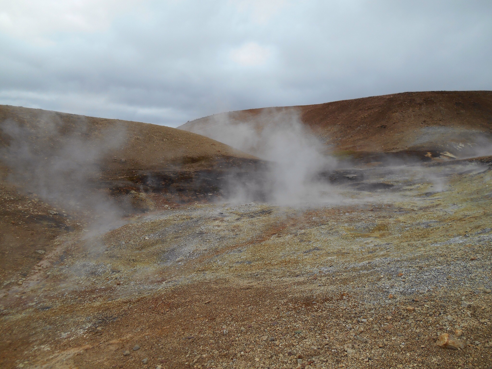 At our new altitude we truly felt like we were in the highlands. The air was cooler and we passed through snow as we climbed up and down the ridges. Now we were truly aware of the geothermal activity. The ground was steaming, the sulphur smell adding to our unwashed socks. The streams bubbled and marvellous colours marked the landscape. The thick layers of snow were shaped by spiralling steam leaving the vents and every step brought new things to our attention.