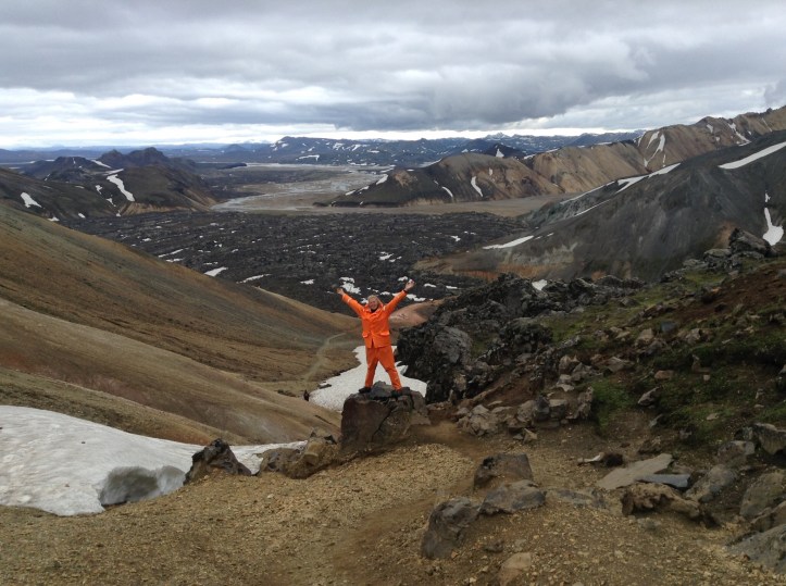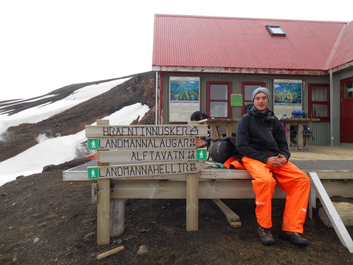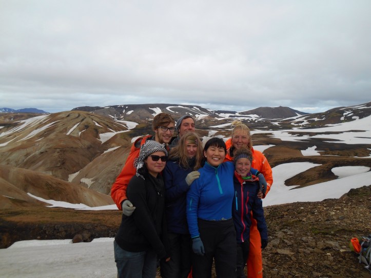The highlight of the day was by far the vast amount of sliding opportunities as we crossed large snow plateaus. The snow proved a tiring challenge but made for a beautiful landscape as we climbed ever up. Just as we neared the end the trail revealed its final secrets, a vast lava field where eerie shapes and figures lurked. The mountains here were multicoloured like something out of a child’s drawing of another planet.