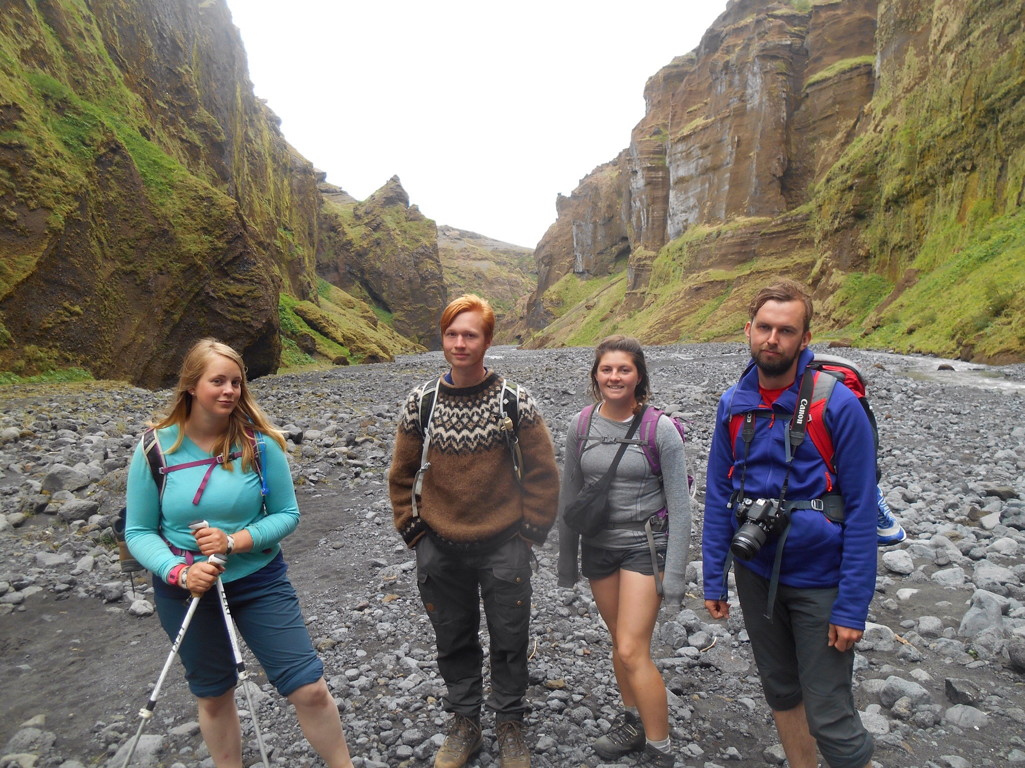 The next day we explored the other valley, walking along a sheltered path through Morsadalur to another glacier with a powerful waterfall feeding into it. This vast ice face ended in a glacial lake with breakaway icebergs. The icy blue breakaways slowly moved around each other, resembling different shapes and animals. For some of the group the icy water was tempting and first strode in to touch the closest berg, then invigorated some of the others stripped off for a swim. I enjoyed the screams of cold from a sunny spot on the bank. As we retraced our steps past waterfalls and troll like rocks, stopping to take photos impersonating trolls and even a trelfie.