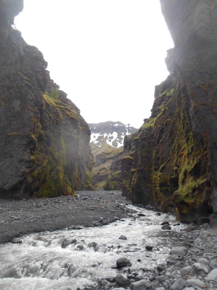 We had planned to hike up the mountain hut on the newly formed glaciers of Eyafjallayokull on the Sunday however a severe weather warning promised 20metres per second gusts and tackling a ridge walk suddenly didn’t seem so fun. On our side of the valley however we appeared to remain sheltered so we put on our river crossing shoes, wincing as we crossed the fast flowing, glacial streams and set off to explore the hidden enclaves of the opposite mountain range. Diverting off the rustic road we followed the rocky paths crossing smaller and smaller streams towards an impressive waterfall. We were becoming smaller in contrast to the towering walls strewn with moss and greenery.