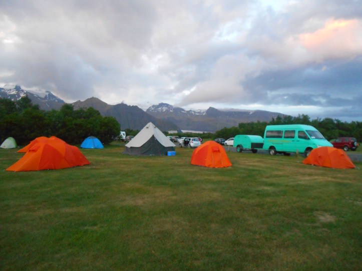 We dozed on and off waking up to moonlike landscapes, late afternoon pulling into Skaftafell national park. It sits on the west side of Vatnajokull glacier, a huge expanse of ice taking up a massive chunk of eastern Iceland, 8% of the country. Welcomed as trail volunteers we set up our tents and made for another of Iceland’s iconic falls, Svartifoss. An easy trail took us up to the impressive falls, again with the basalt columns overhanging and a deluge of water rushing over. This symmetrical design was borrowed in the design of Reykjavik’s opera house.