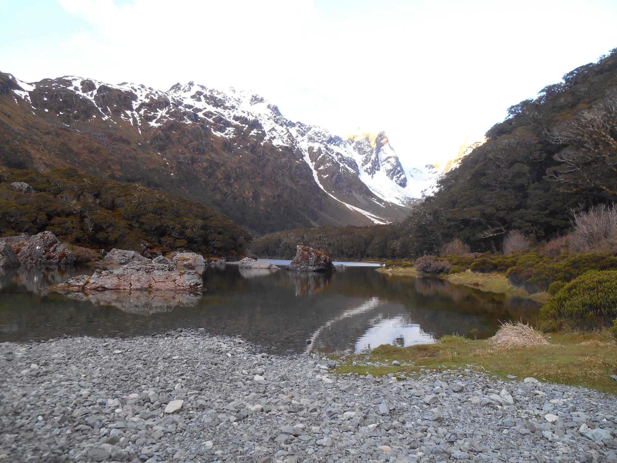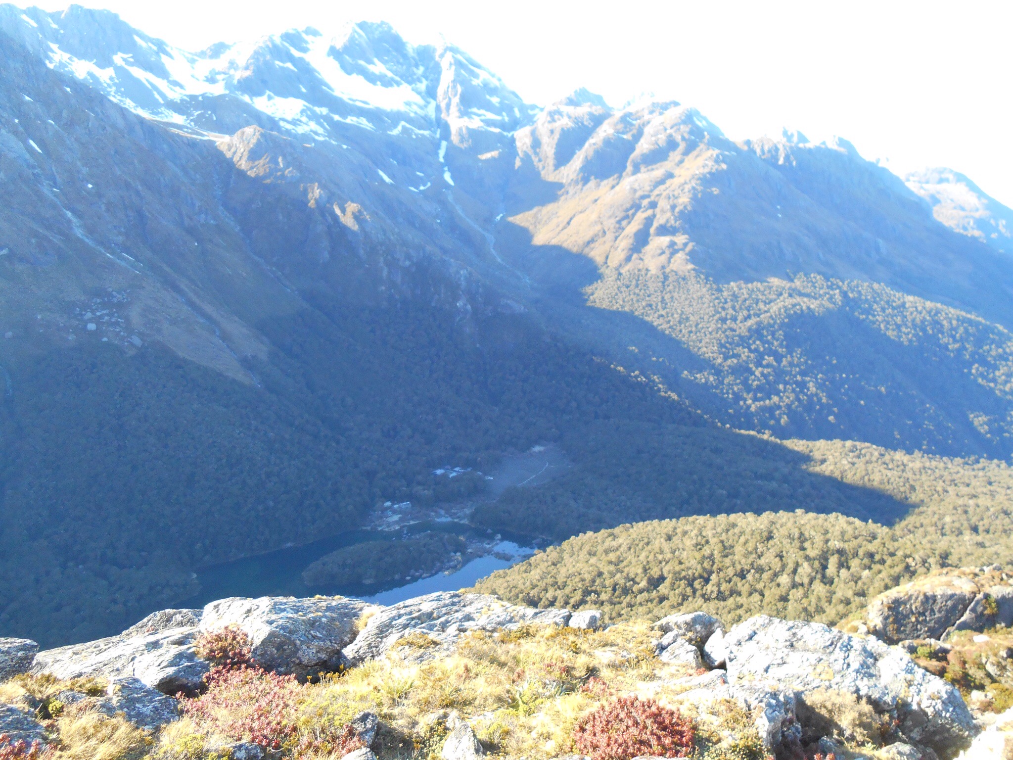 We were driven to the divide, the meeting point of the three rivers, Hollyford, Eglington and the Greenstone. The first part of the walk was a steep ascent and with backpacks and a warm afternoon we were feeling not as clean as when we first started. From Key Summit we could make out the surrounding landscape, Lake Marion and the Hollyford Valley. From here we said goodbye to Ina who had accompanied us this far, and pressed on, and up to Lake Mackenzie hut.