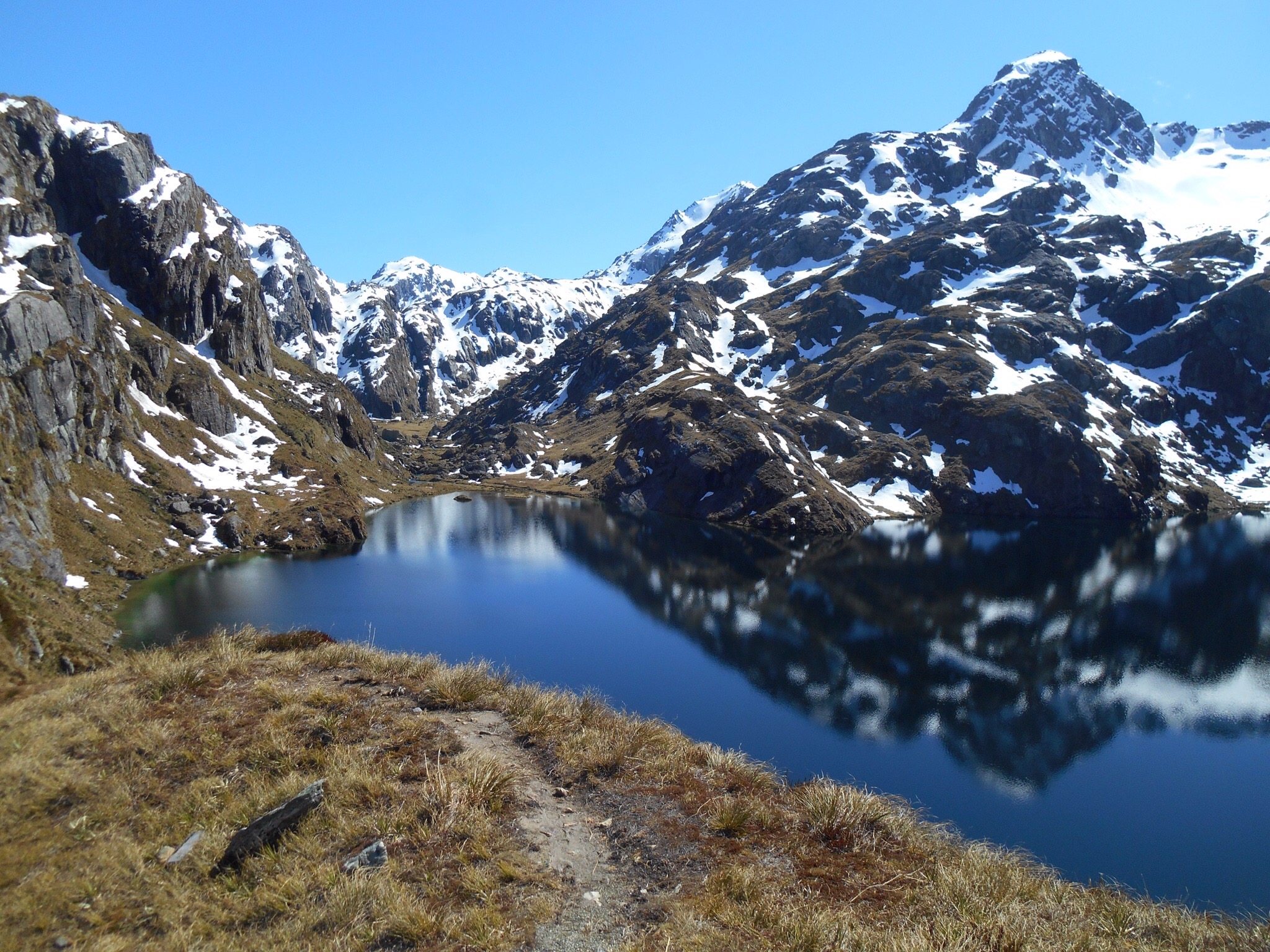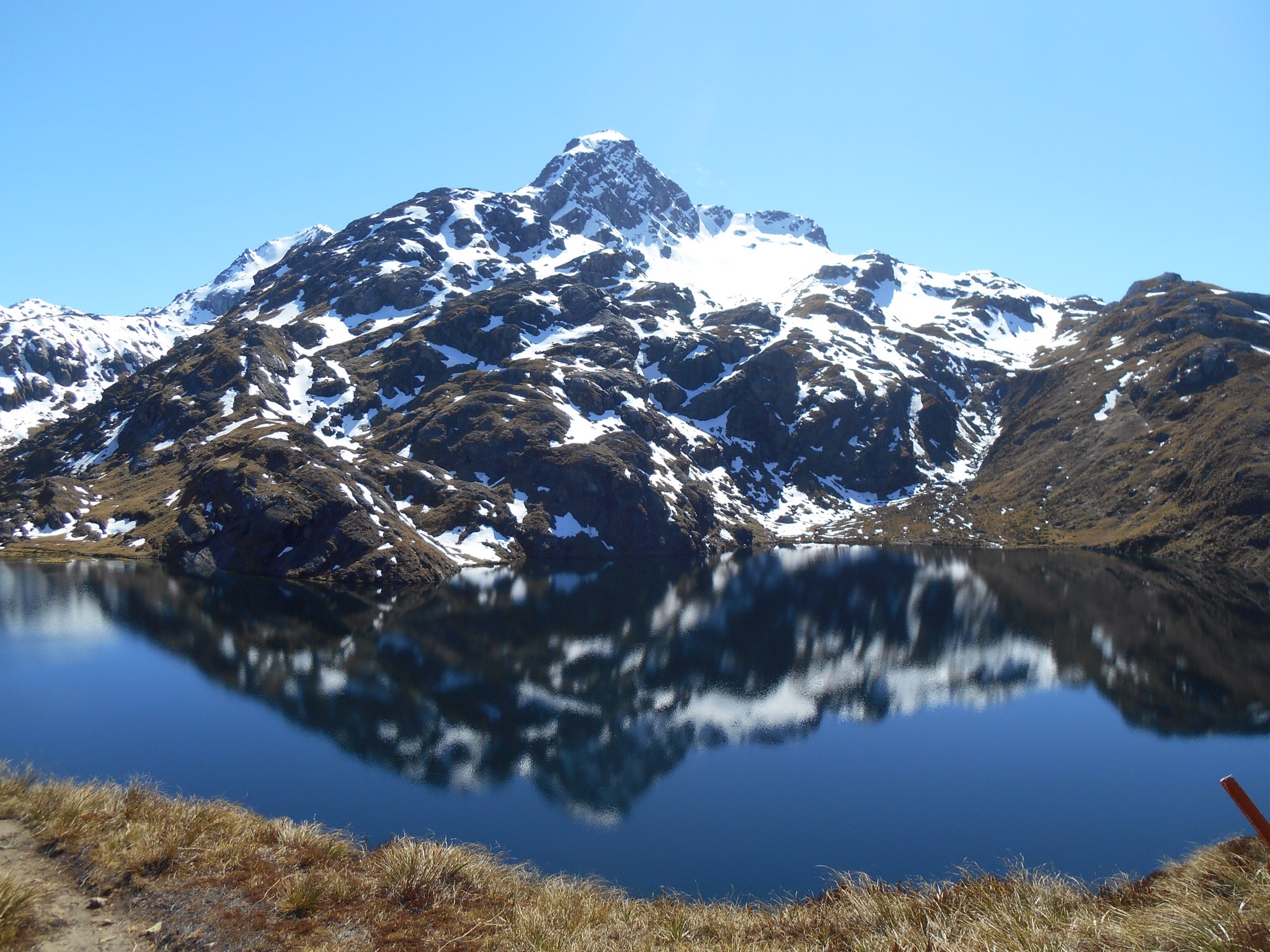 From the saddle we passed beautiful calm lakes which reflected the snow freckled mountains like Dalmatian spots, crossed a snow ridge and began climbing down through mountain to the next hut, then forest trail to the last. On the flat we wound lakeside closer to the end, our spiritedly steps slowing.