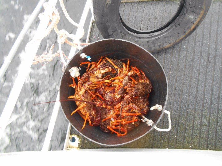 Over to pull the crayfish pot baited two days earlier. 7 crayfish and one confused carpet shark.