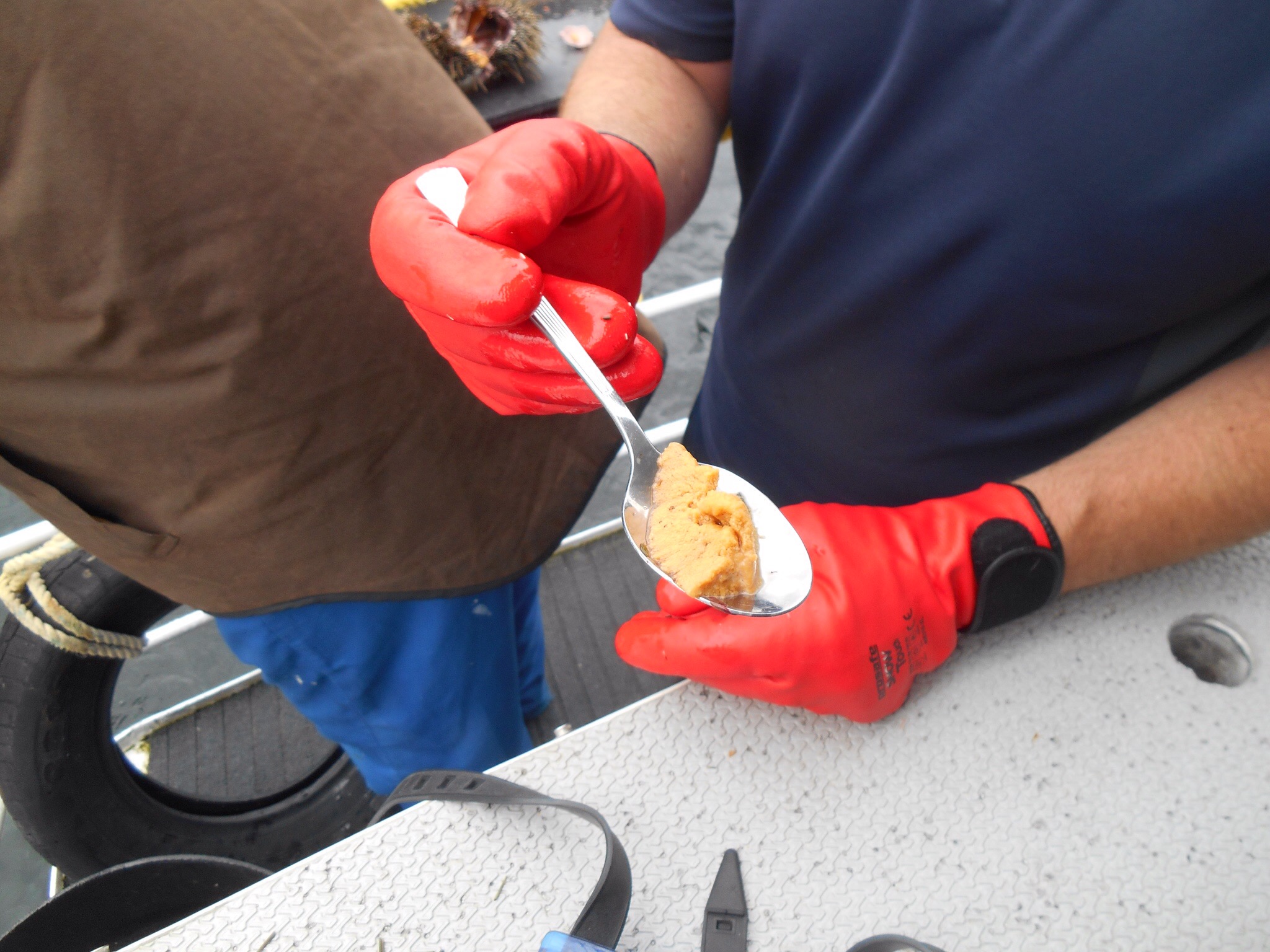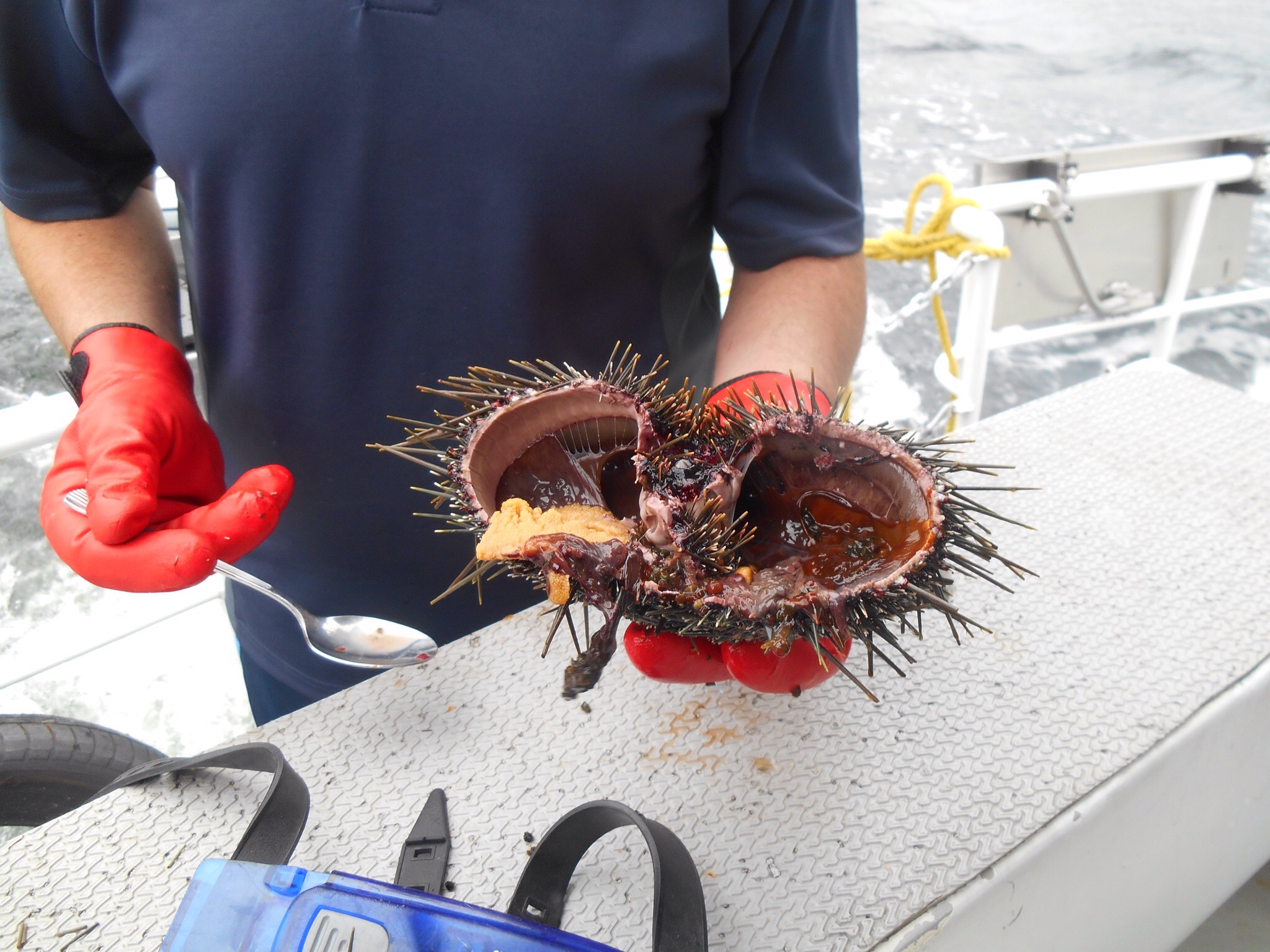 Also caught was one sea urchin (Kina) a Maori delicacy. Kina Roe (eggs) sampled by hardy crew members Lauren and Nadia.