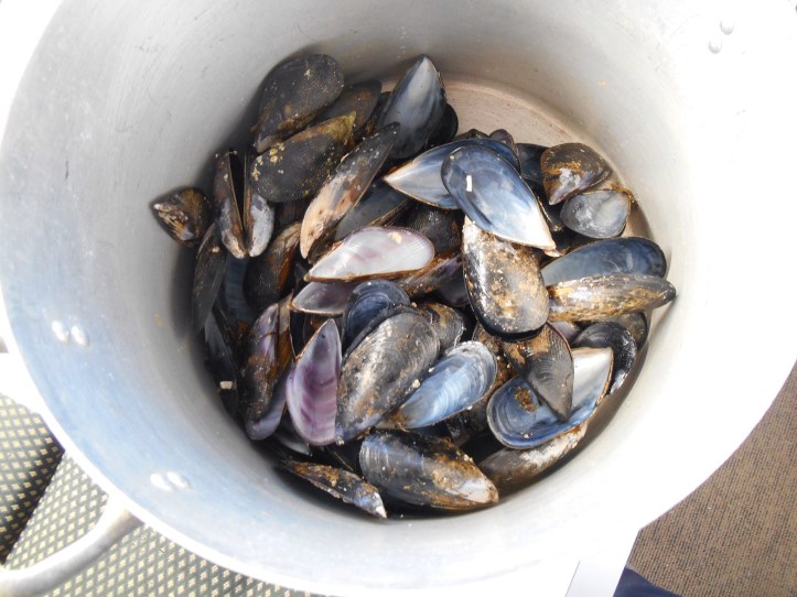 Team begins descaling the black mussels on the back of the boat. Mussels steamed for lunch.