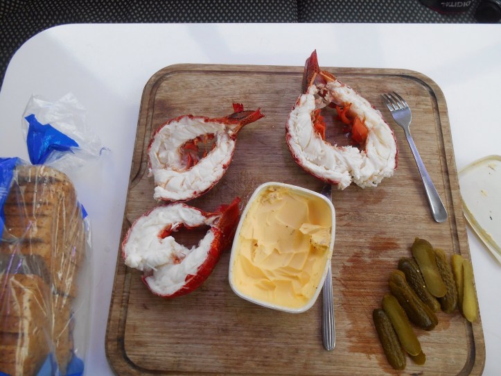 Lauren awoken for early dive with Jamie. Successful haul of Crayfish with one clamping Lauren’s hand memorably hard.
