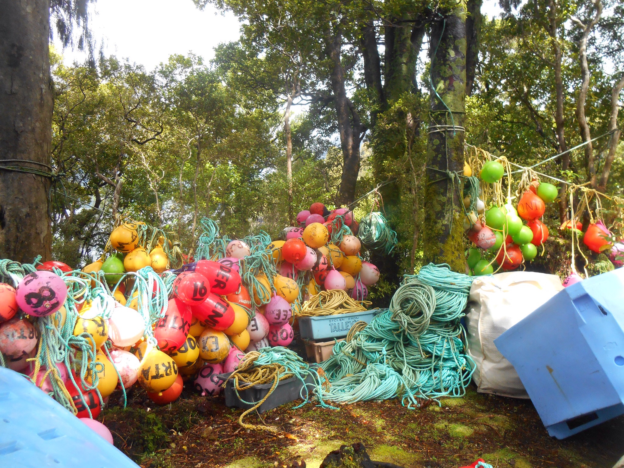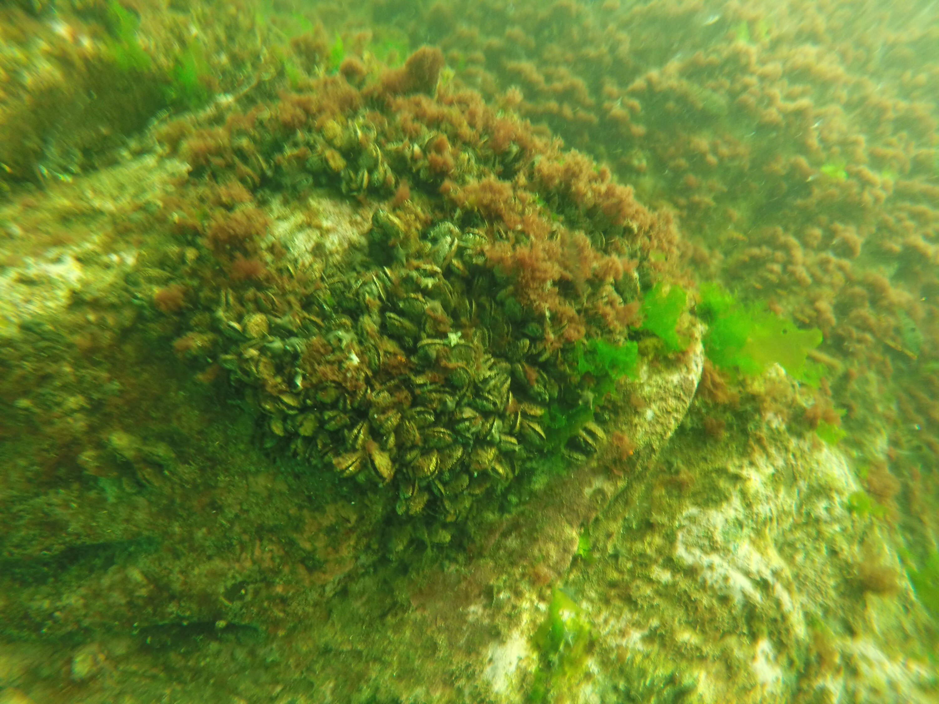 Huge walls of black mussels covered in red and green seaweed, some harvested for lunch.