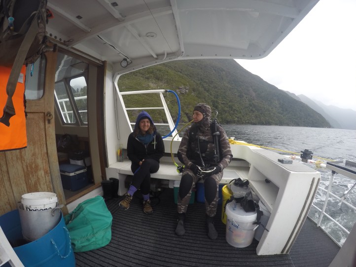Andy, one of the crew on the boat on the Tutuko was a friend from Milford. A quick radio conversation and I threw together my dive gear to join them for a dive. Once on their slightly more sturdy boat we headed down the length of Doubtful sound to the front. There are lots of small islands which make up the front, so we passed through the narrow channel, nicknamed ‘the gut’ and out to shelter Islands, two quaintly names rocks, the ‘hares ears’ and on to the Nee Islands where hundreds of New Zealand Fur Seals slumbered all over the rock, competing for the top spot.
