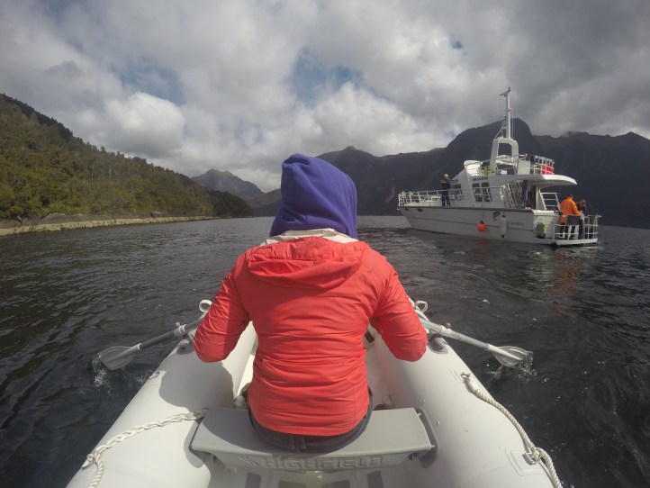 Nadia and Lauren take the dinghy for a row and end up paddling in circles. Beautiful panorama opportunities of Doubtful sound.