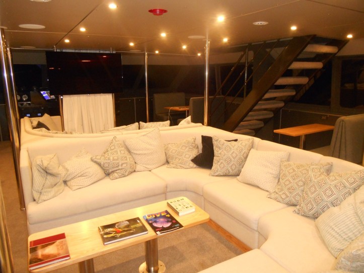 Rod and I experienced 5 star luxury upon the Fiordland Jewel overnight cruise one sunny night in the fjord. We work closely with their company and were able to go on a spy mission onboard adopting our familiar persona of acting like an old married couple. The catamaran takes 20 but was relatively empty, so we each had a double ensuite room, the height of luxury being that we had automatic blinds on the windows. The fiord looked magical as we powered out to Sterling Falls, the drone flying above us recording our path. We docked for the night in Harrison Cove, the only safe anchorage in Milford, and got aboard the tender for a close up look.
