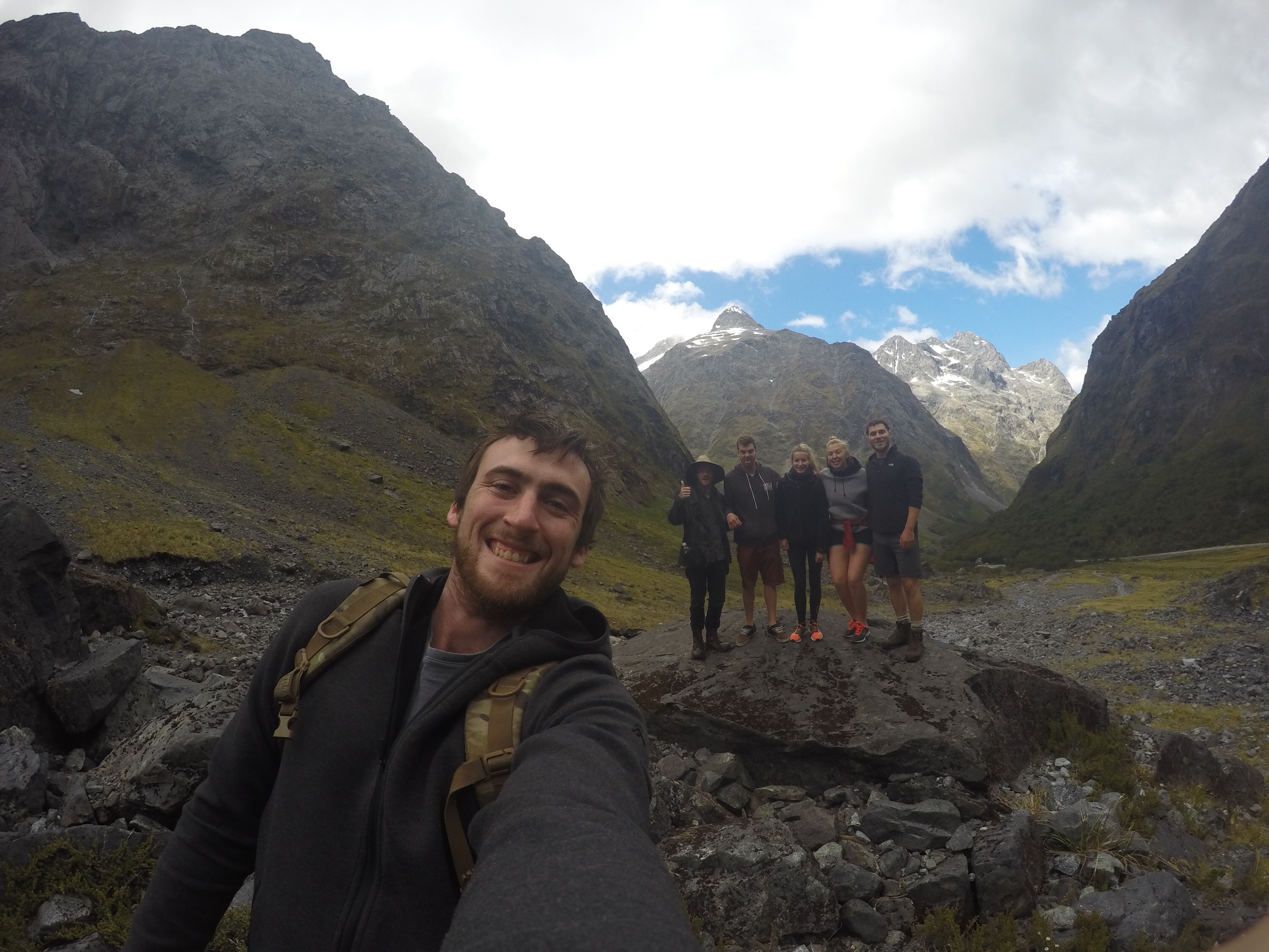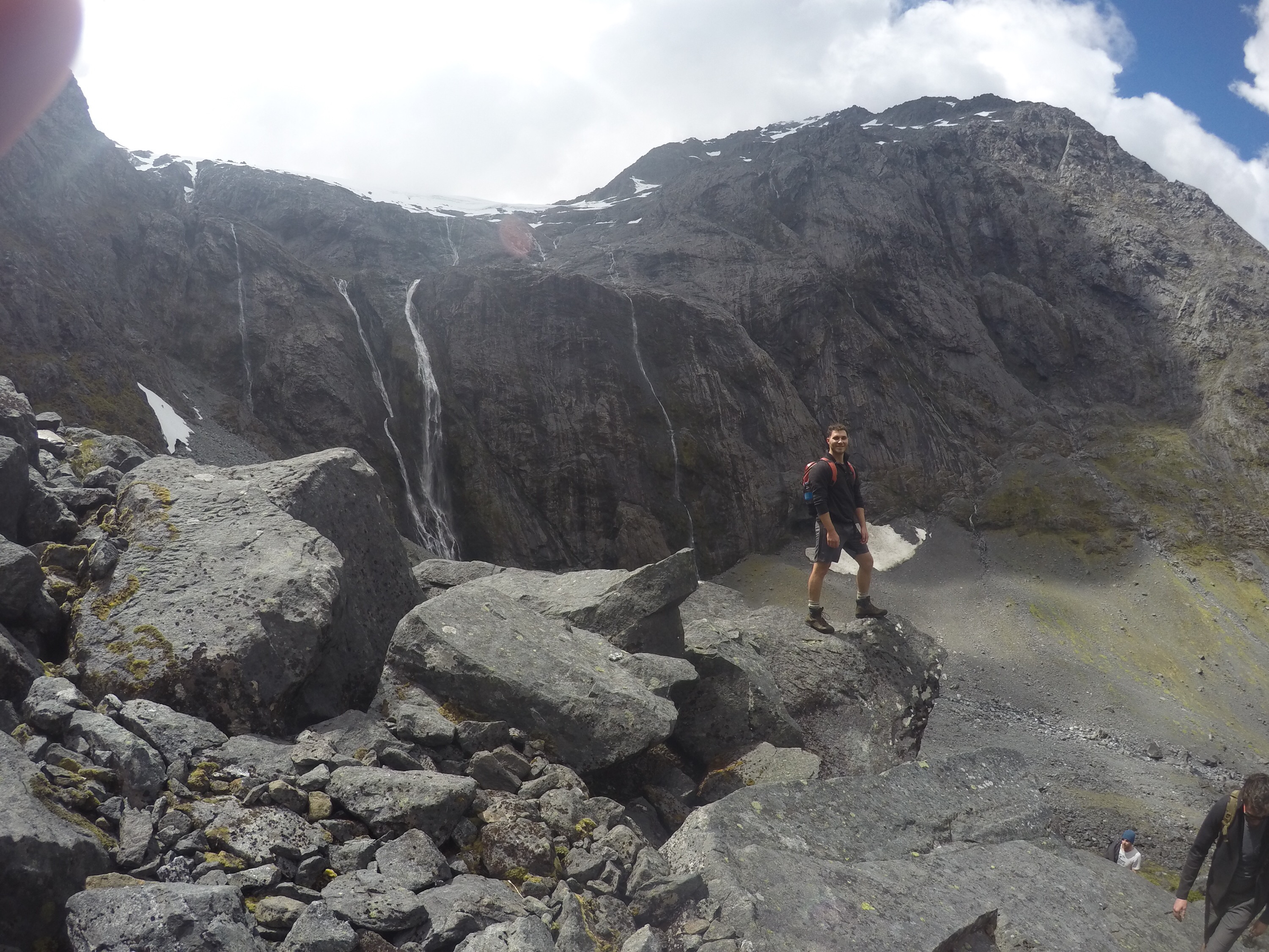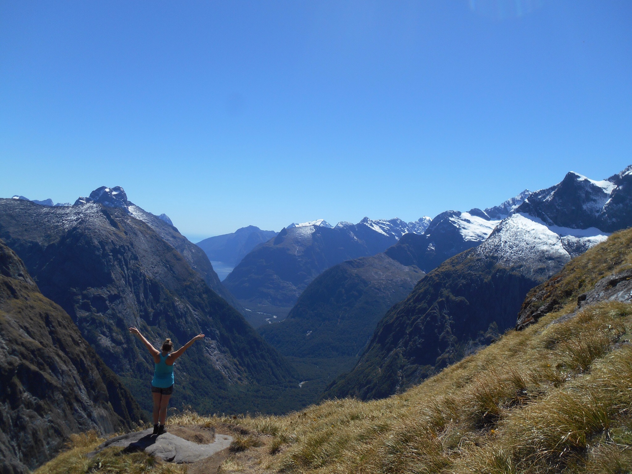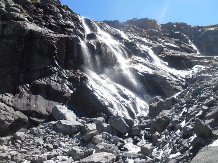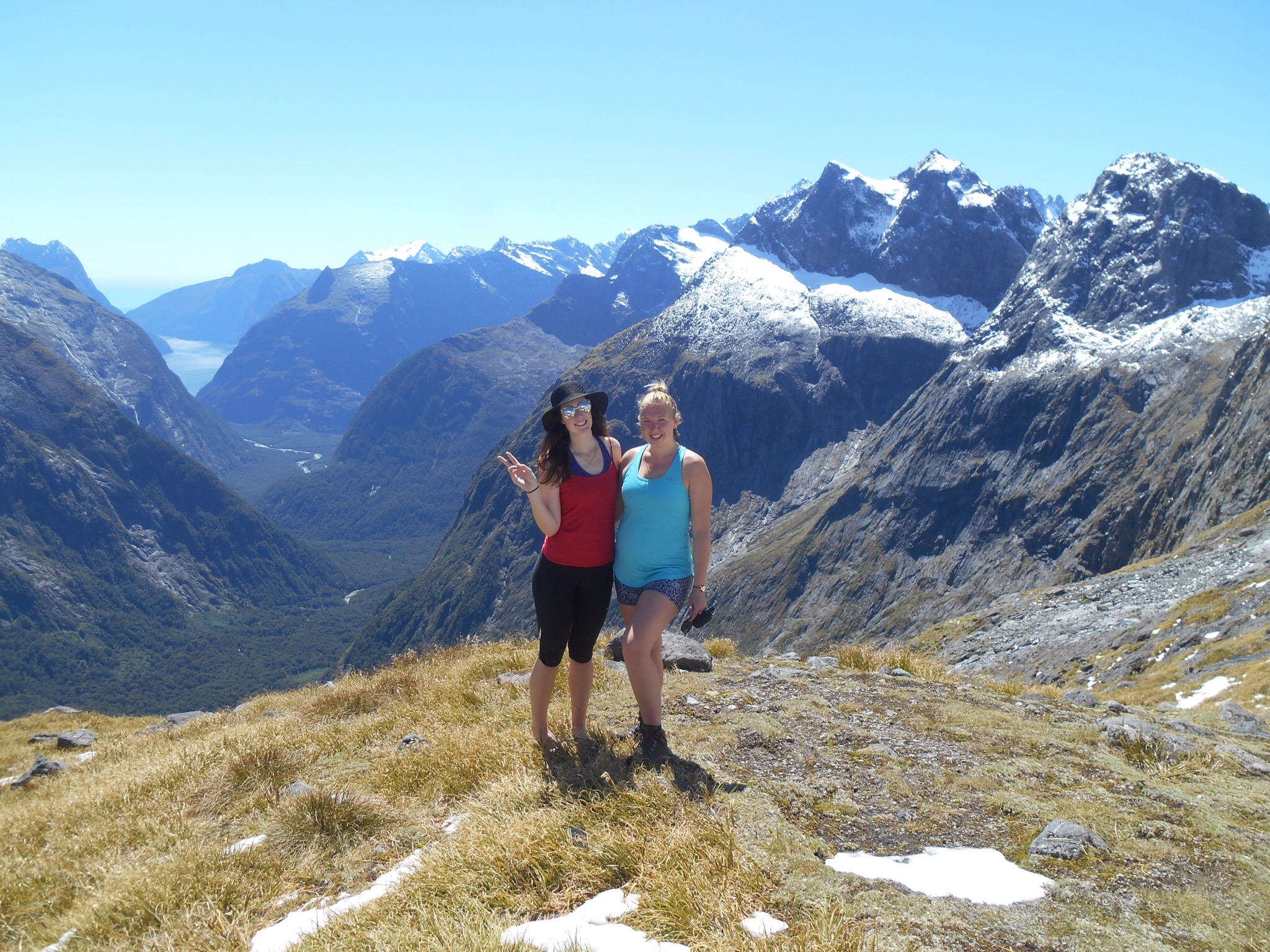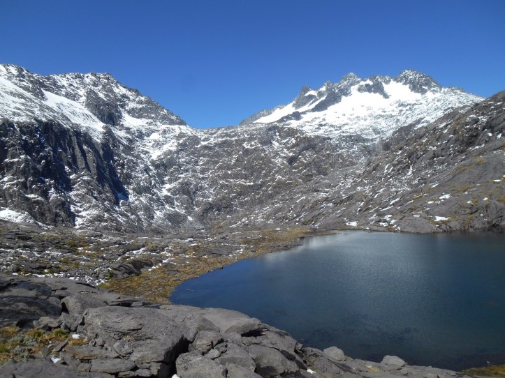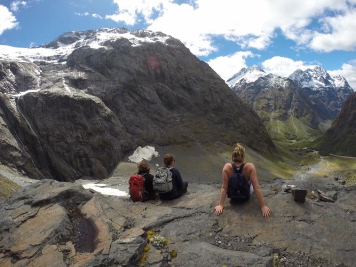 Another incredible view could be gained from Gertrude Saddle. From the valley, the other tall Lauren and I walked through tussock before climbing alongside cascading waterfalls of unseasonal melting snow until we reached a lake. The water was crystal clear, the bottom visible in the depths. In the heat the cold water was tempting, but we resisted opting to climb higher up the steep rocks. As we reached the plateau the view was incredible paying over the valley and Milford sound feeding into the ocean. The boats were small specs dwarfed by the mountains. We climbed higher and higher addicted to the expansive view, behind us new lakes coming into view. As we climbed down we went off track to one of the hidden lakes, a perfect spot for a refreshingly cold swim. Another amazing tick for the Milford Bucket list.