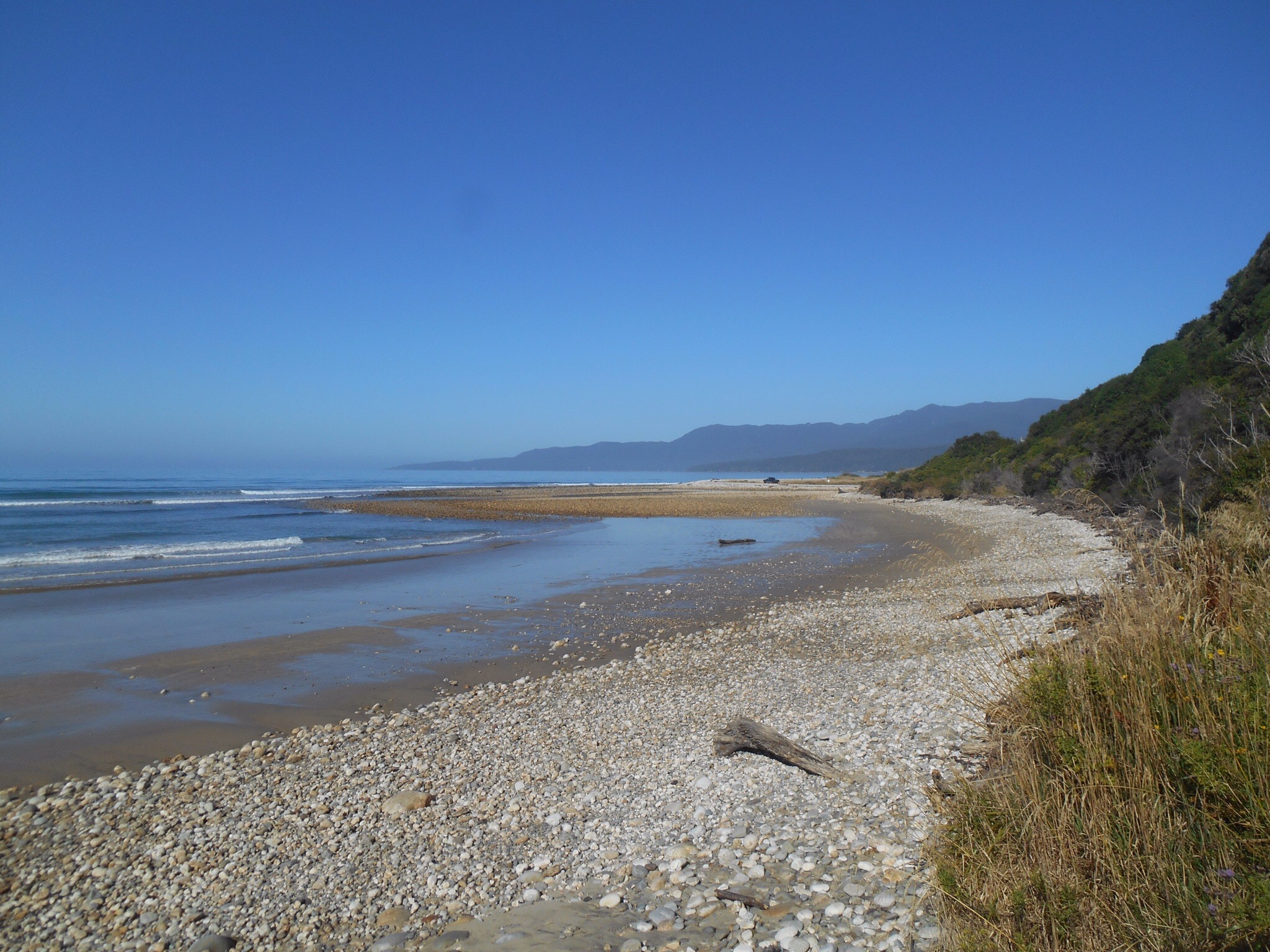 We got a coffee and headed down the gravel track to the start of the track, neglecting to check in with the information centre, so had to ring to get garbled instructions over the phone, so on a whim and a prayer we set off through the forest to the coast. After a short while we were walking long white sand beaches reminiscent of the Mediterranean. As we walked, chatting away we noticed Hectors Dolphins playing in the surf very close to the shore and couldn’t resist jumping in with them for a swim.