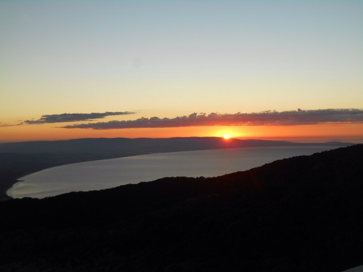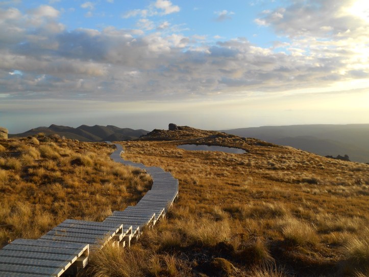 We were walking through the tree line with occasional glimpses of spectacular views. We enjoyed burning calves, forest snack stops and finally emerged at Stag rock from which we could see Bluff, Stewart Island and the stunning white coastline. We could finally appreciate how far we had climbed that day. Another hour later and we arrived to Okaka lodge situated on the hilltop with welcoming tea, coffee and showers. The balcony looked down into the valley, and a summit track above looked over the surroundings. After a relax, a meal and a briefing about the next day, we marched up the boardwalk to watch sunset. Beautiful juts of rock sat out of the hillside accompanied by glacial tarns. As we walked we spotted faces in the rock and mountain lilies in the grass. Around the back of the mount, Lake Hauroko came into view, shadowed by the mountains and the dipping sun which ignited the clouds into beautiful pinks and oranges.