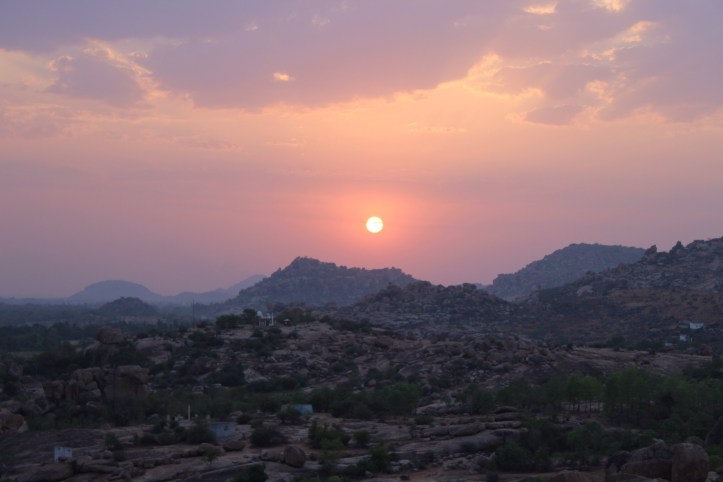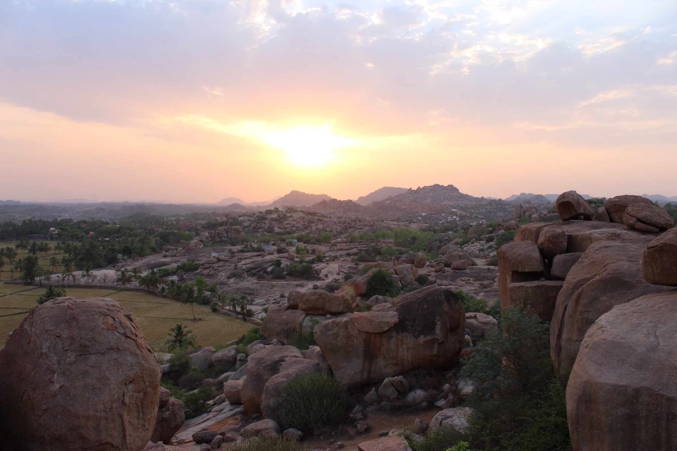 On every horizon is stacks of rounded boulders. The ones near our hostel we set to climbing for sunset, the rocks still hot from the days sun. You quickly gained height over the neat paddocks, rows of Palm trees and out to the temple complexes beyond. The sun burnt big and red on the horizon, the end of another Indian day.