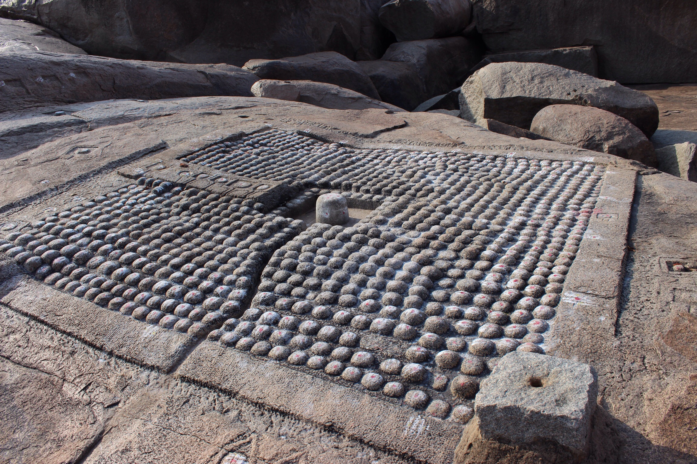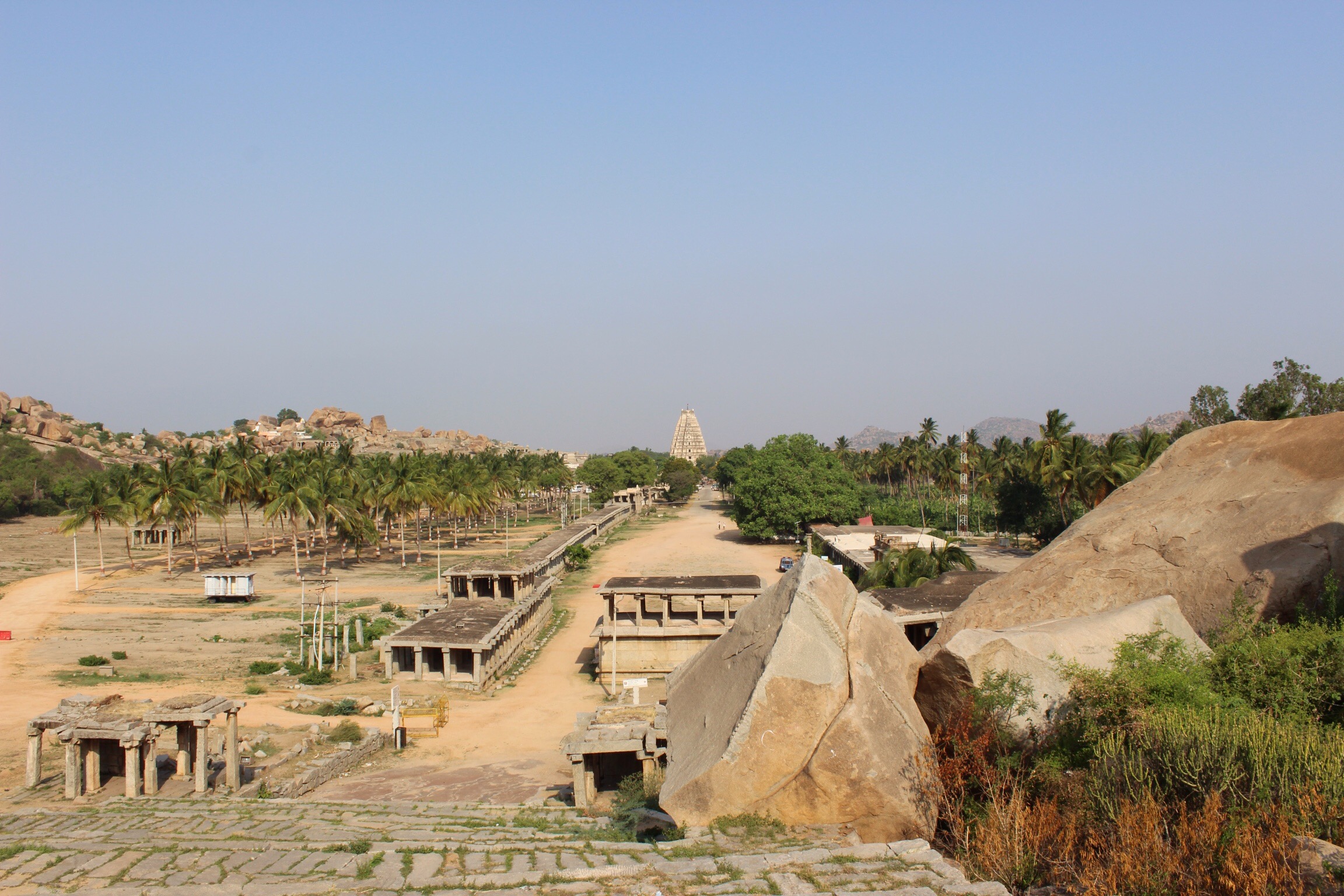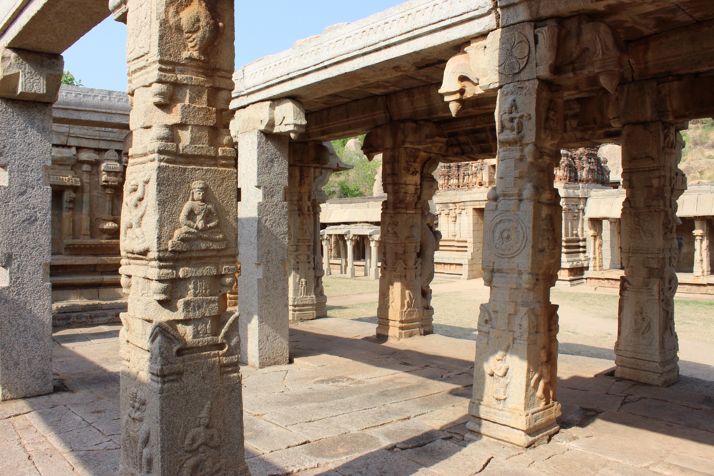 Further along the avenue we climbed up over some boulders. The area was overgrown with gangly cactus and looked like a scene from the Wild West, however just over the hill was a whole another town complex, abandoned in amazing condition with no one around. The temples were dedicated to Vishnu with symbolatary and meaning throughout. Beyond the temples, more market streets, stone pillars forming each shop front, leading as far as the eye could see, to the river.
