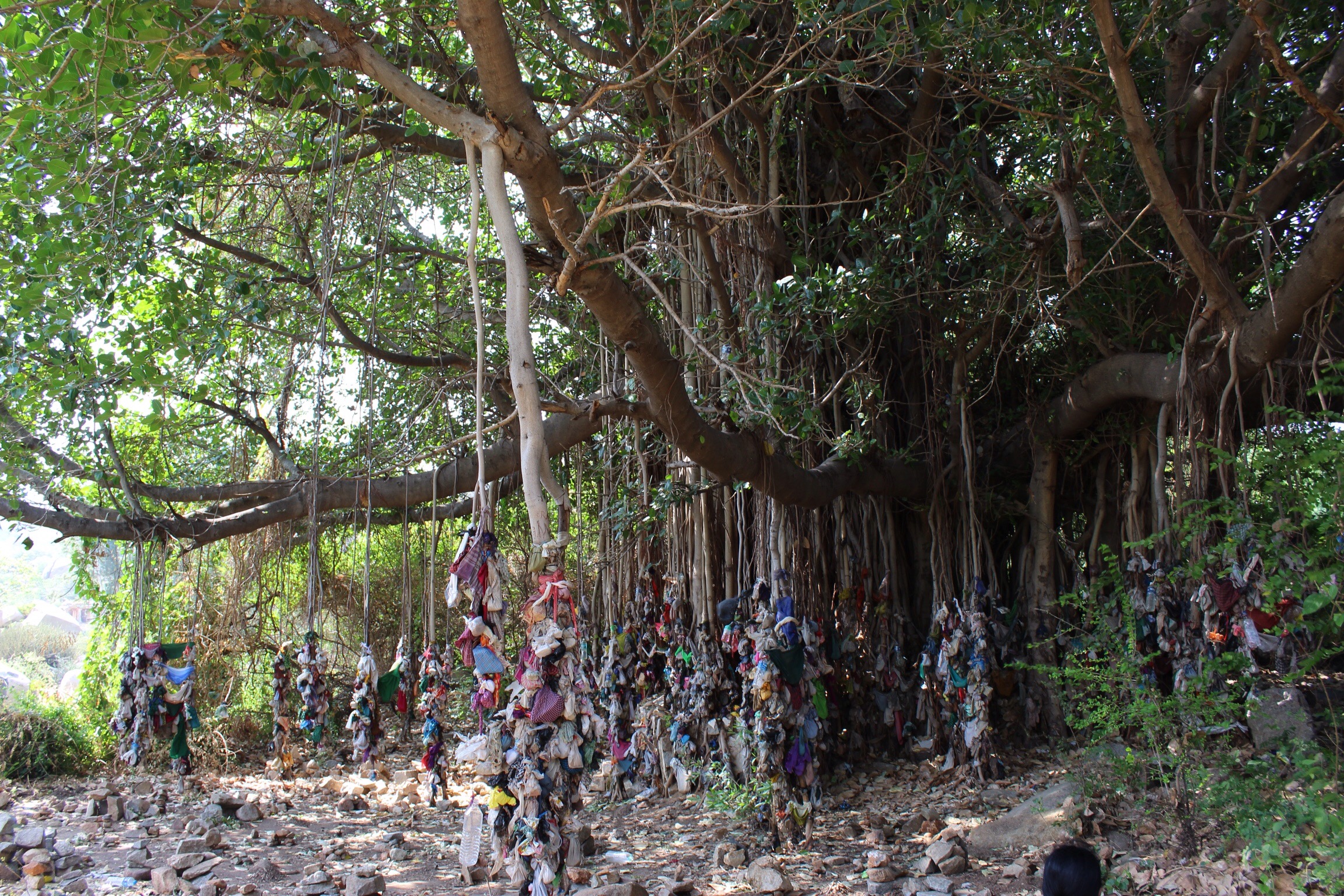 We followed the avenue to the waters edge where there was none of the commotion of further up the river, just a wooden hut under a tree where we took refuge from the sun. All around the dusty earth, the vegetation was green, palm trees sprouting in masses. Along the rivers edge was a huge, shady Banyan tree, each vine laden down with many coloured fabrics, tied on by people praying for marriage. Below stone piles symbolised prayers for housing.