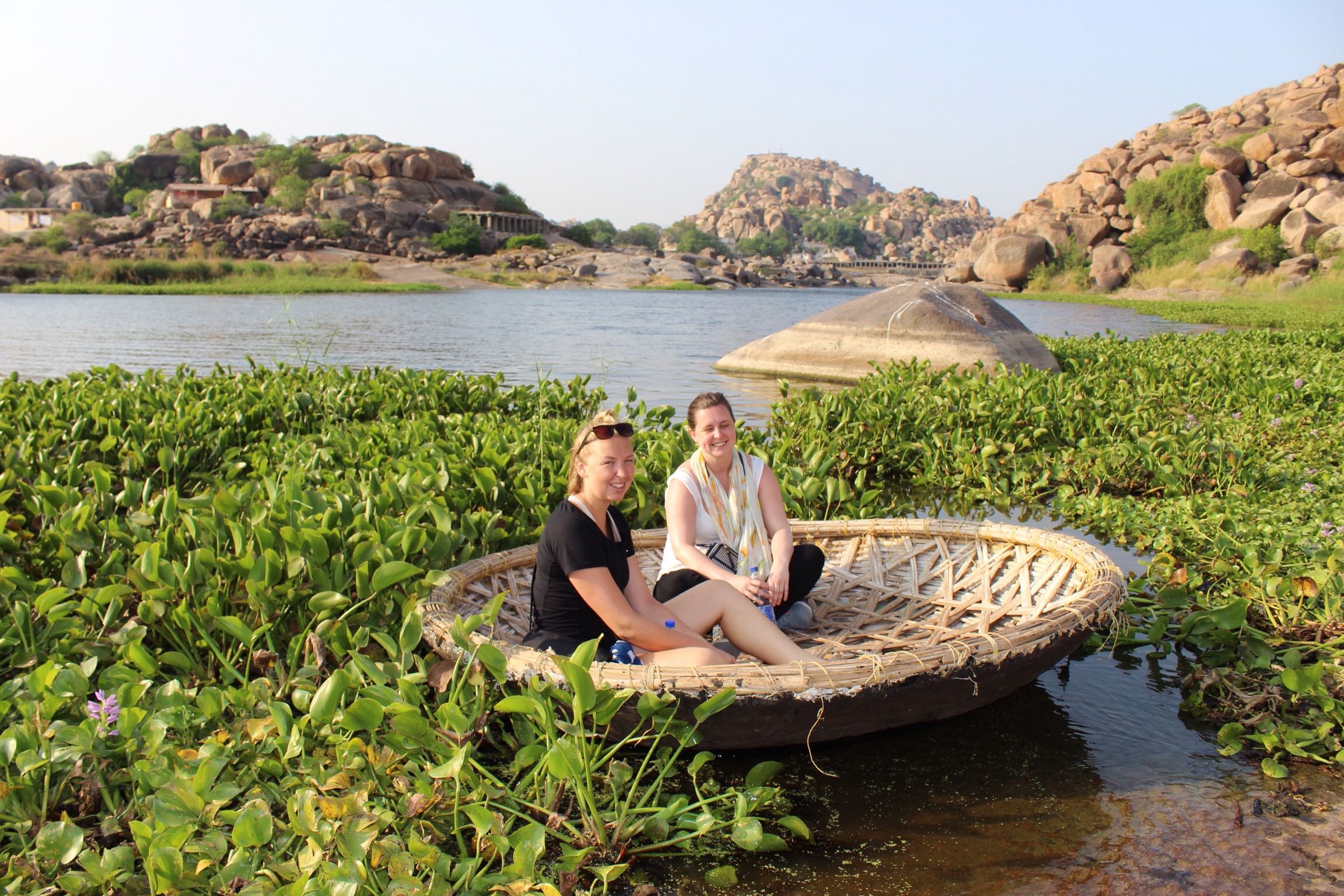 With more activity planned for our next day we had booked to meet a guide at 7am. Getting up with the sun we made for the river. There was drumming and singing, laughter and splashing from the river where the locals bathed and celebrated a new day. The guide arrived 20 minutes later, on Indian time and we all crossed in a Coracle boat, a floating bamboo wok, paddled by two boys with scraps of wood.