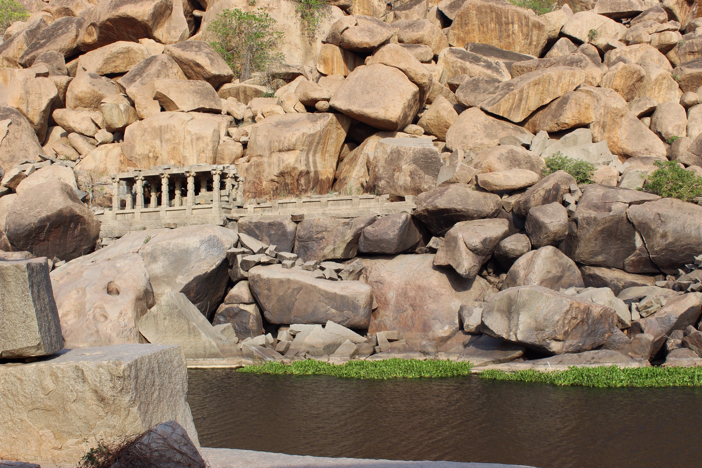 Our final adventure was a scooter ride through the valley. From the outskirts of town our guide produced bikes, one for me and one for him and Tara. Once I had had my orientation through the market place watched by a crowd, we made out for the dusty roads of the valley, overlooked by the gigantic Boulder landscapes. We passed the damned reservoir which has been keeping Hampi fertile the last few years, since the monsoon hasn’t hit the last two seasons. As we weaved through the smaller roads, we passed the remains of the old aqueduct, something which feels far more fitting in Ancient Rome than this tumbledown little Indian settlement.