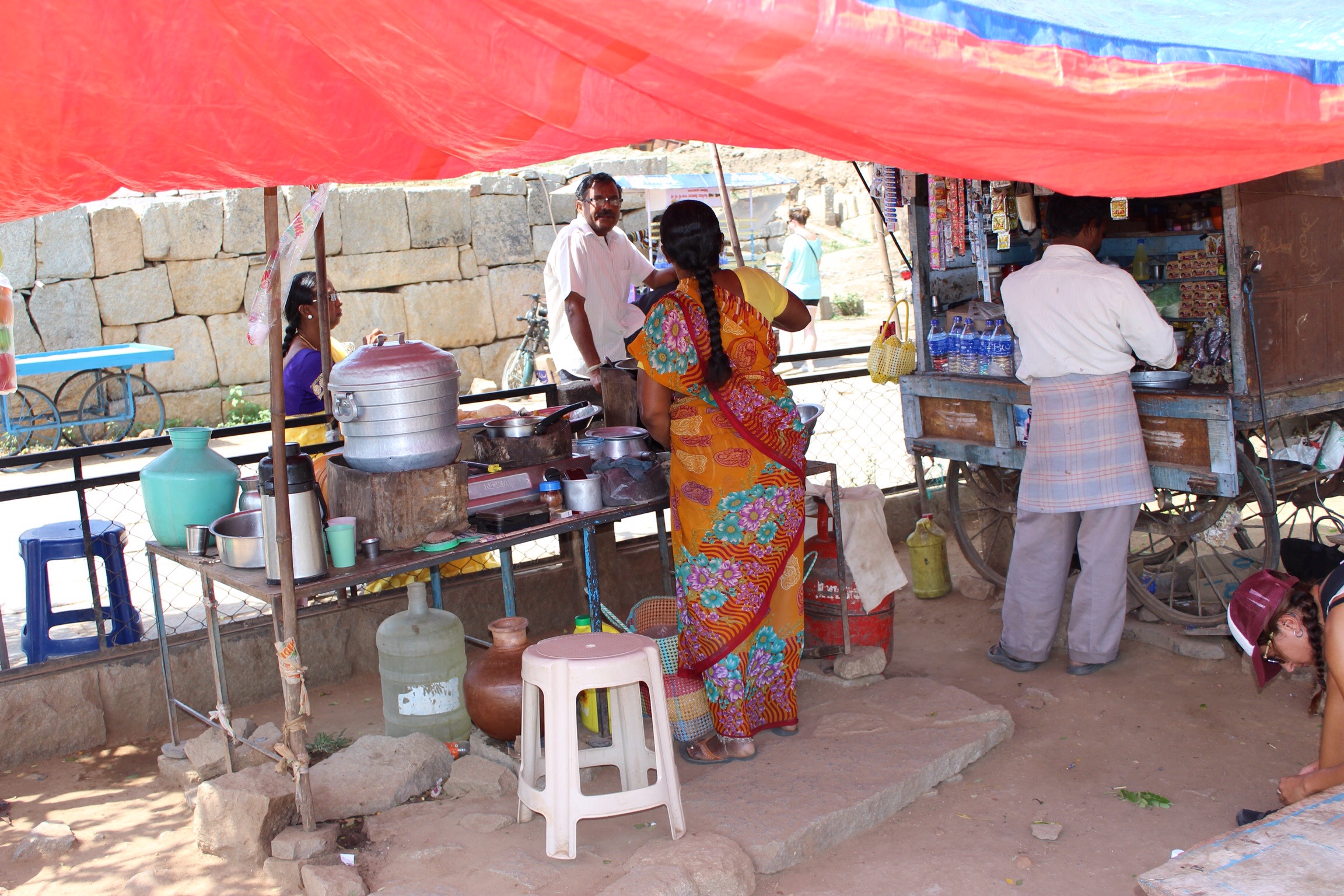 The 50 metre temple stands in the sacred centre, a long avenue which would would have once been a stone marketplace spans in one direction. The guide made the good books and mentioned breakfast taking us to a roadside stall for daal, savoury donuts, rice cakes and sweet chai. Outside the Virupaksha chariot stood, a giant wooden monument used only days before in the annual festival of colour in Hampi.